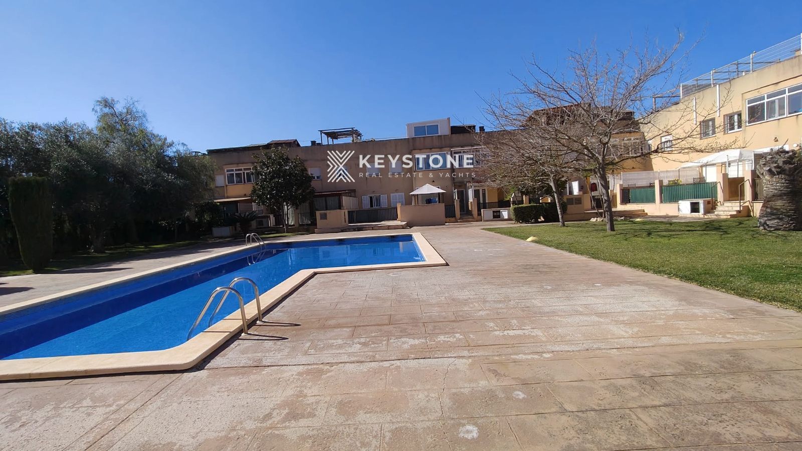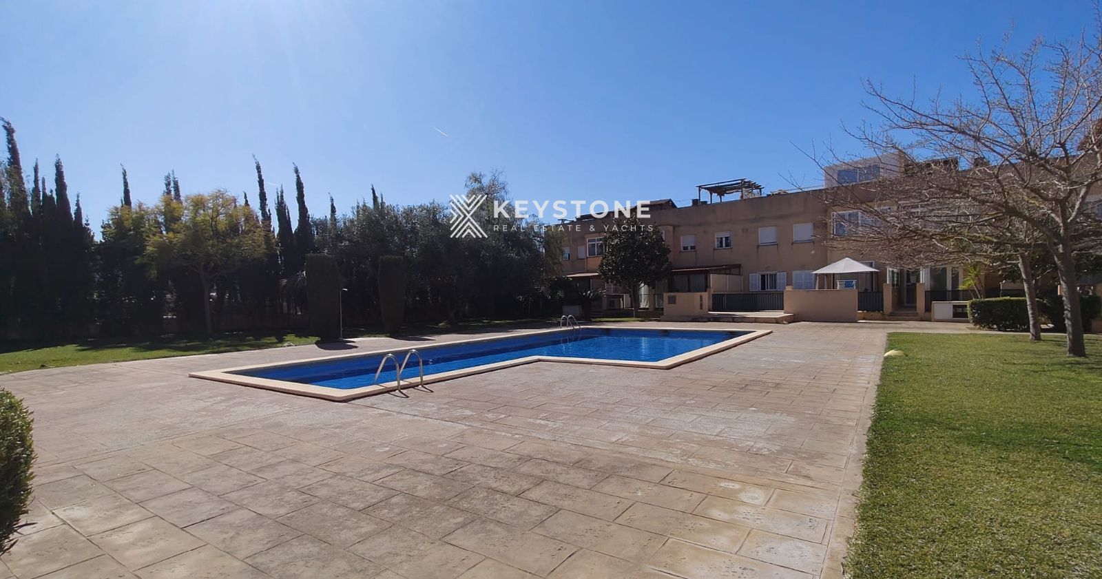 The property is located in a residential complex with a communal swimming pool and gardens, offering a relaxing and comfortable environment. It also includes a garage space and storage room in the same building.