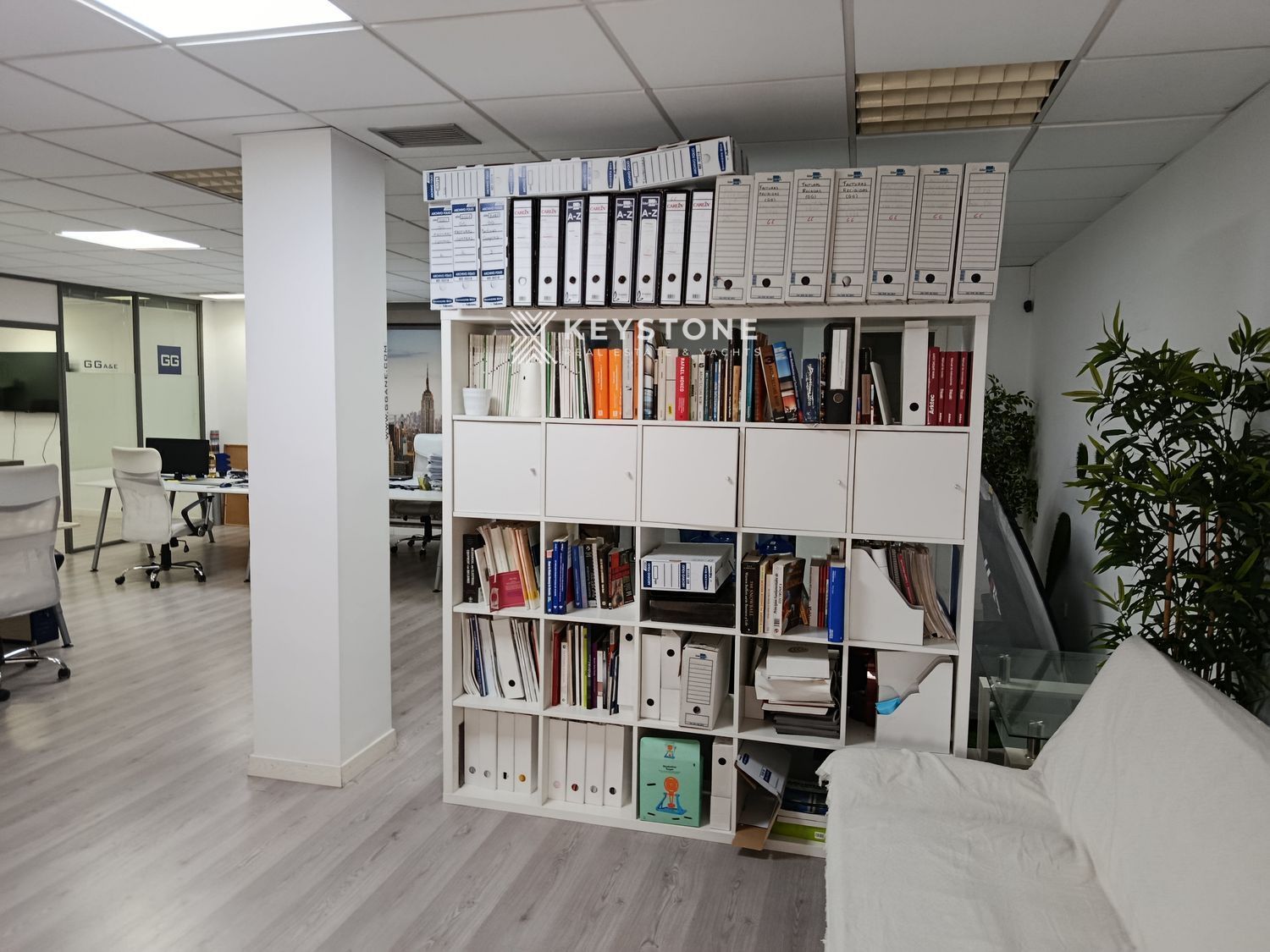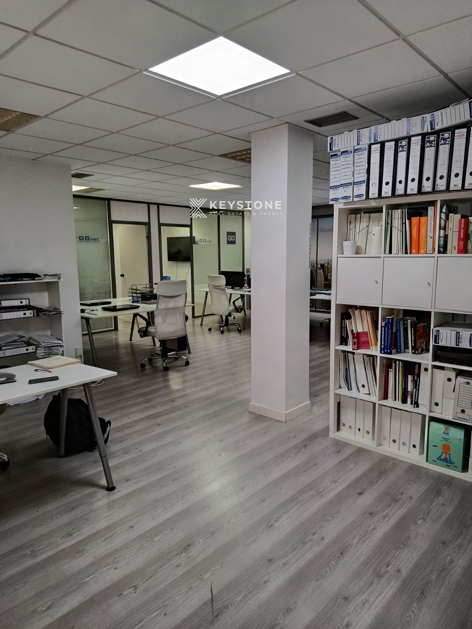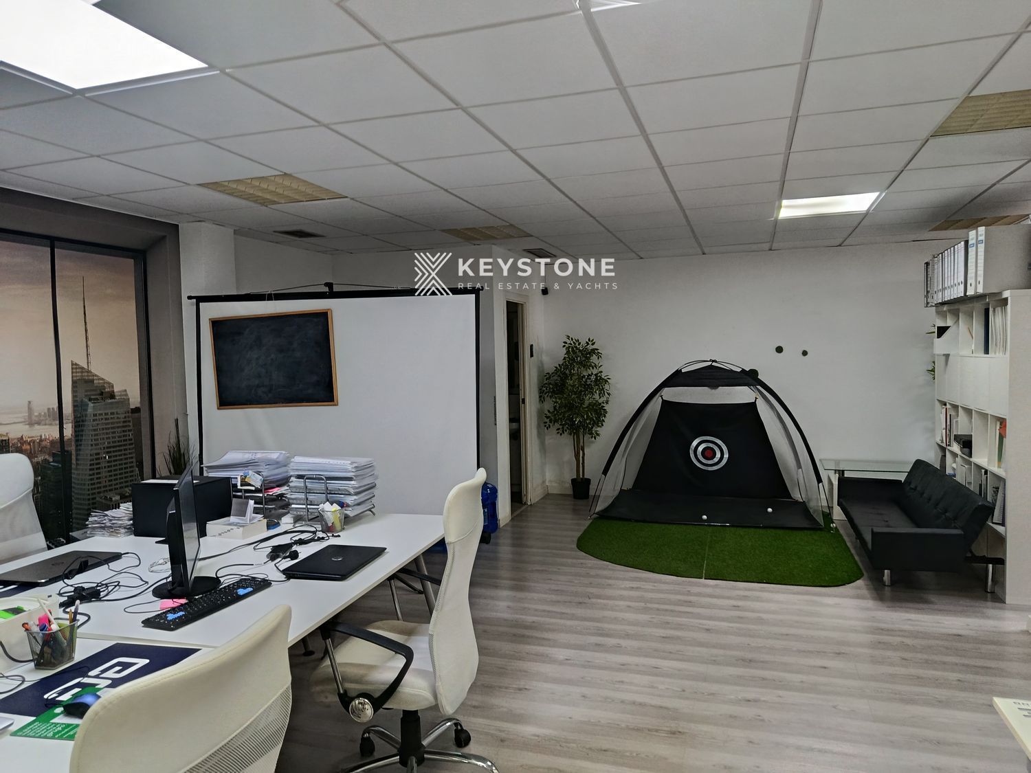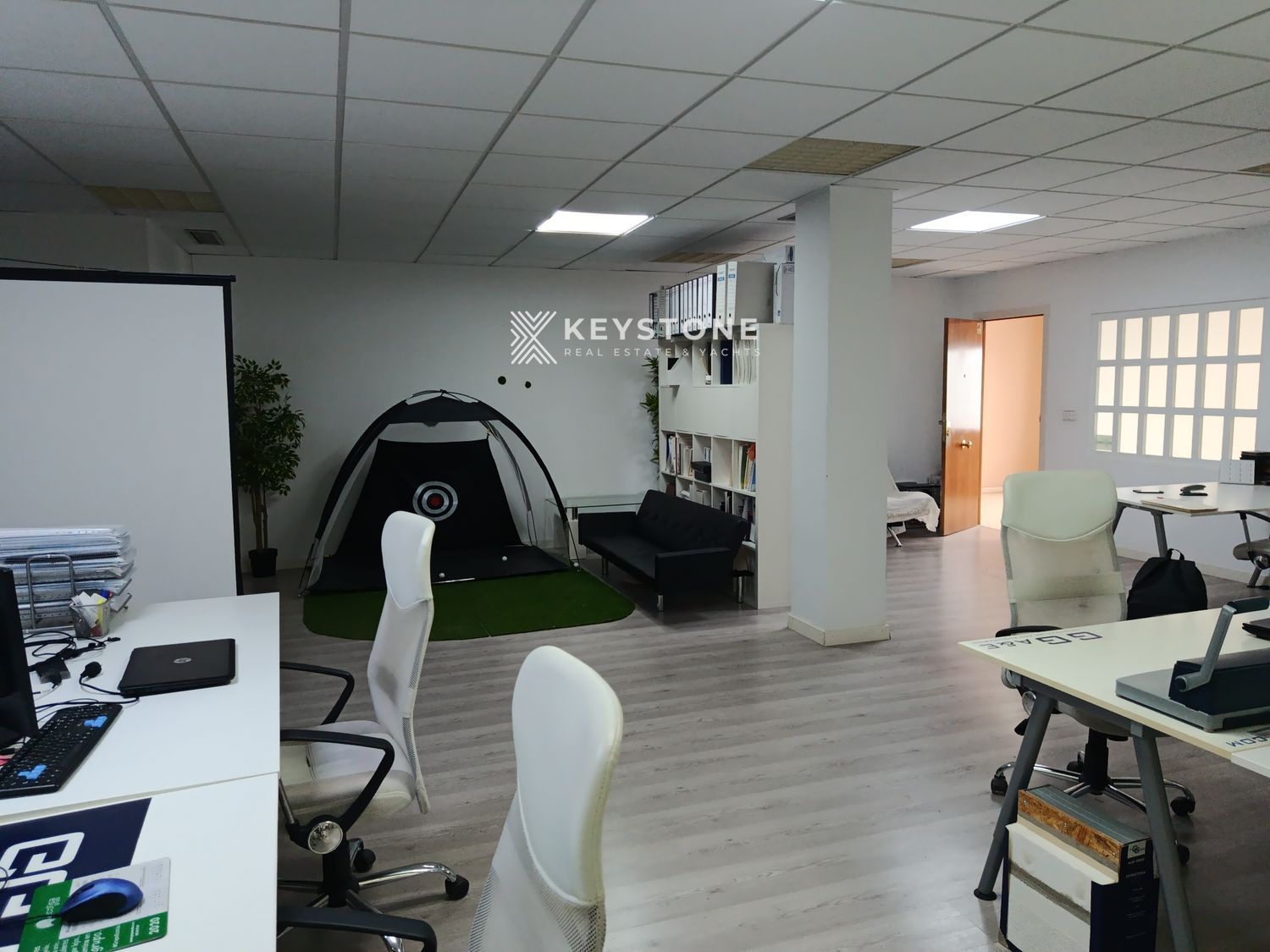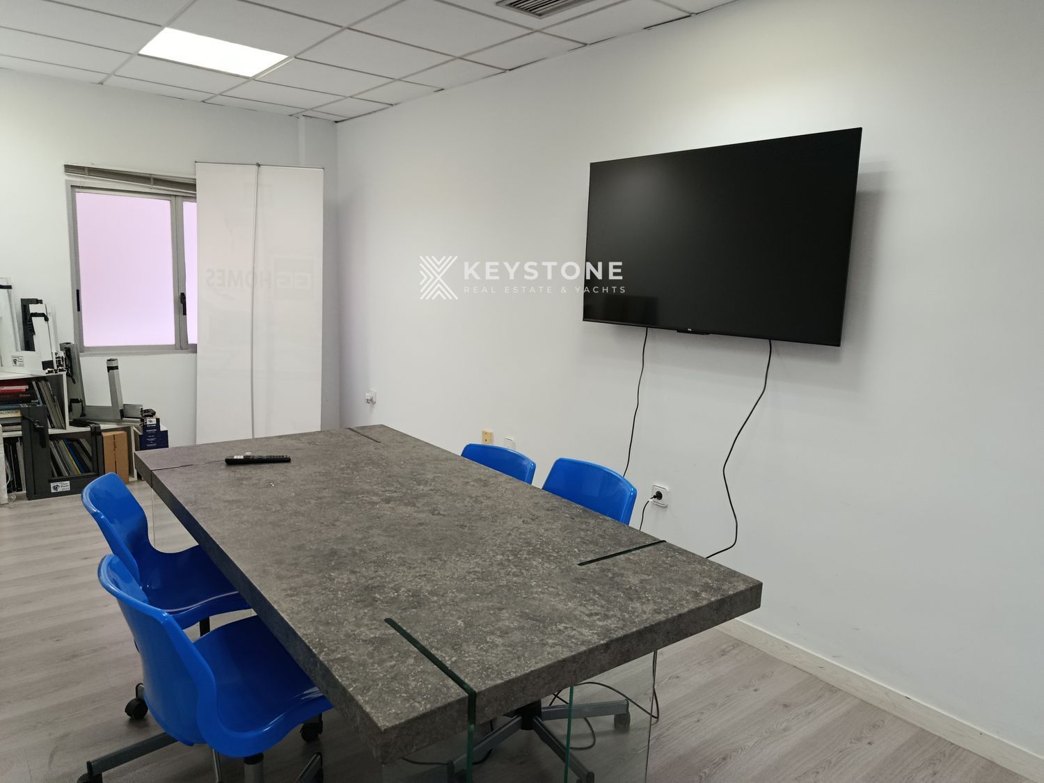 The property offers approximately 100 m² built area and 95 m² usable space, efficiently distributed through partition walls that create separate working areas while maintaining brightness and functionality. The layout includes a private executive office, a fully equipped meeting room and a spacious open-plan work area suitable for multiple workstations.