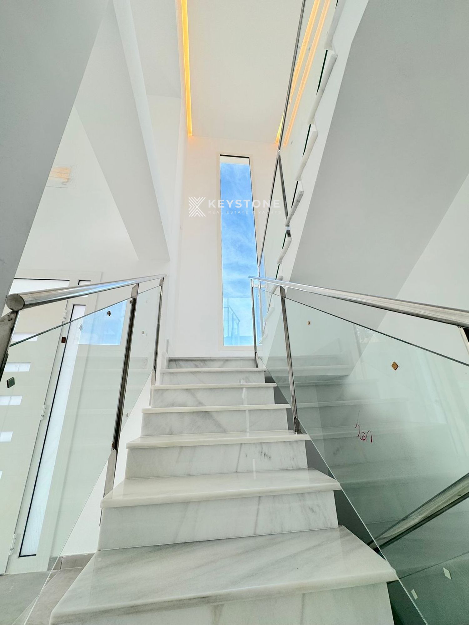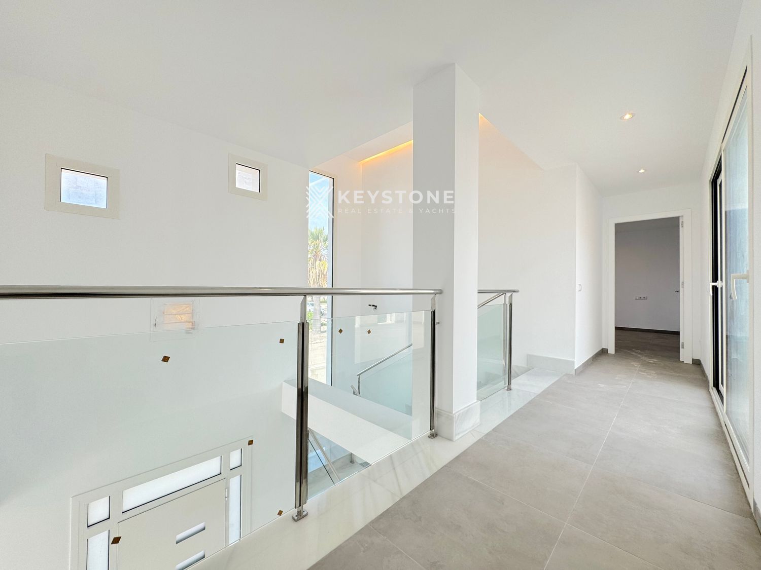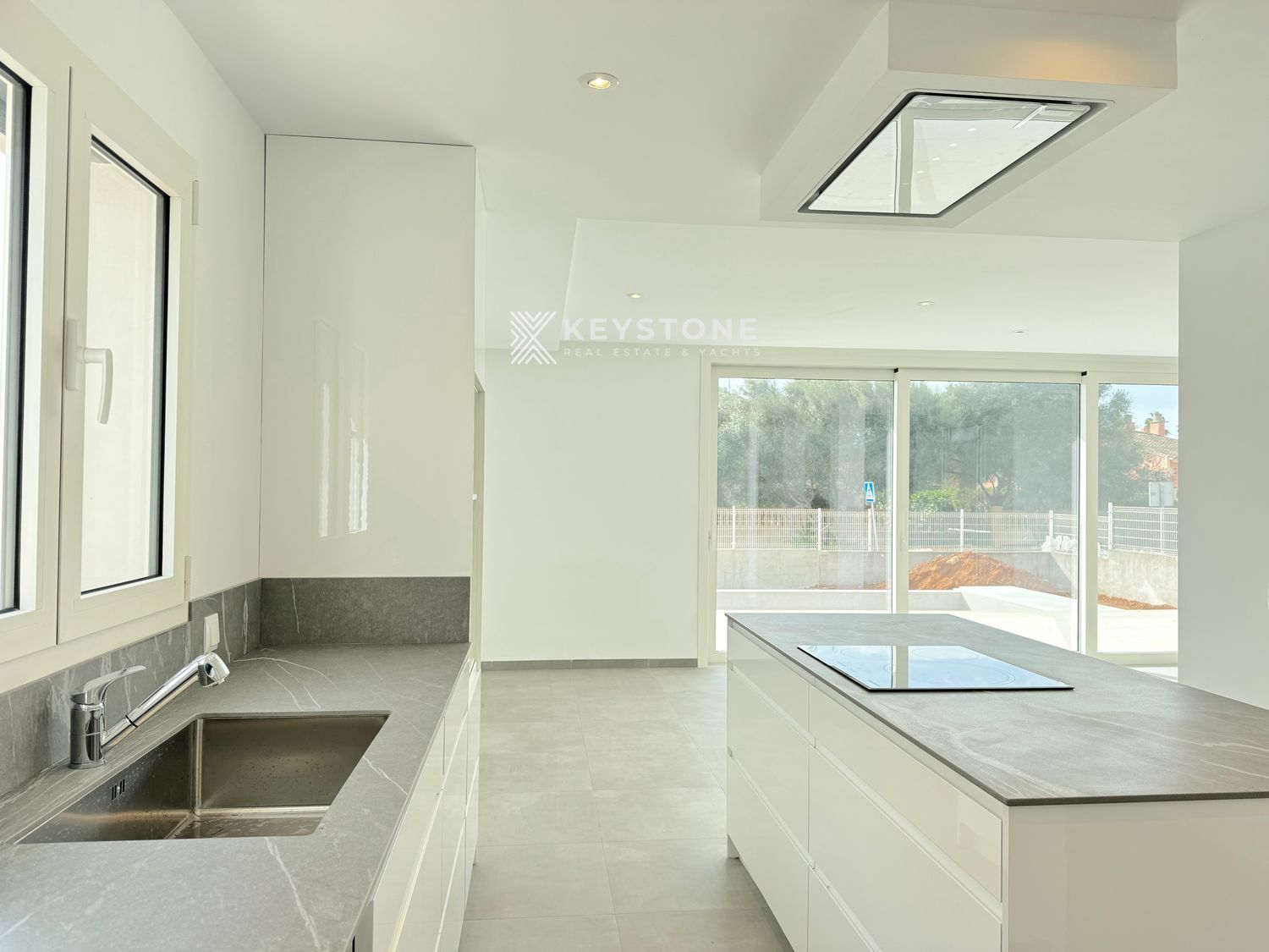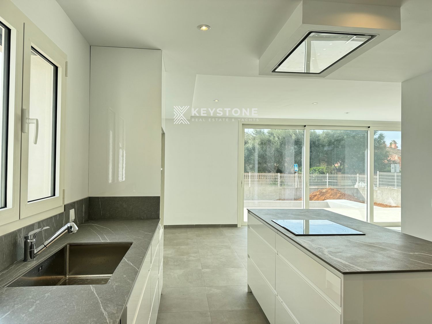 The modern open kitchen with cooking island, the spacious dining area and the bright living room with floor-to-ceiling windows create a stylish and inviting atmosphere. Spread over two floors, the villa offers 4 spacious bedrooms and 4 elegant bathrooms with walk-in showers and high-quality finishes.