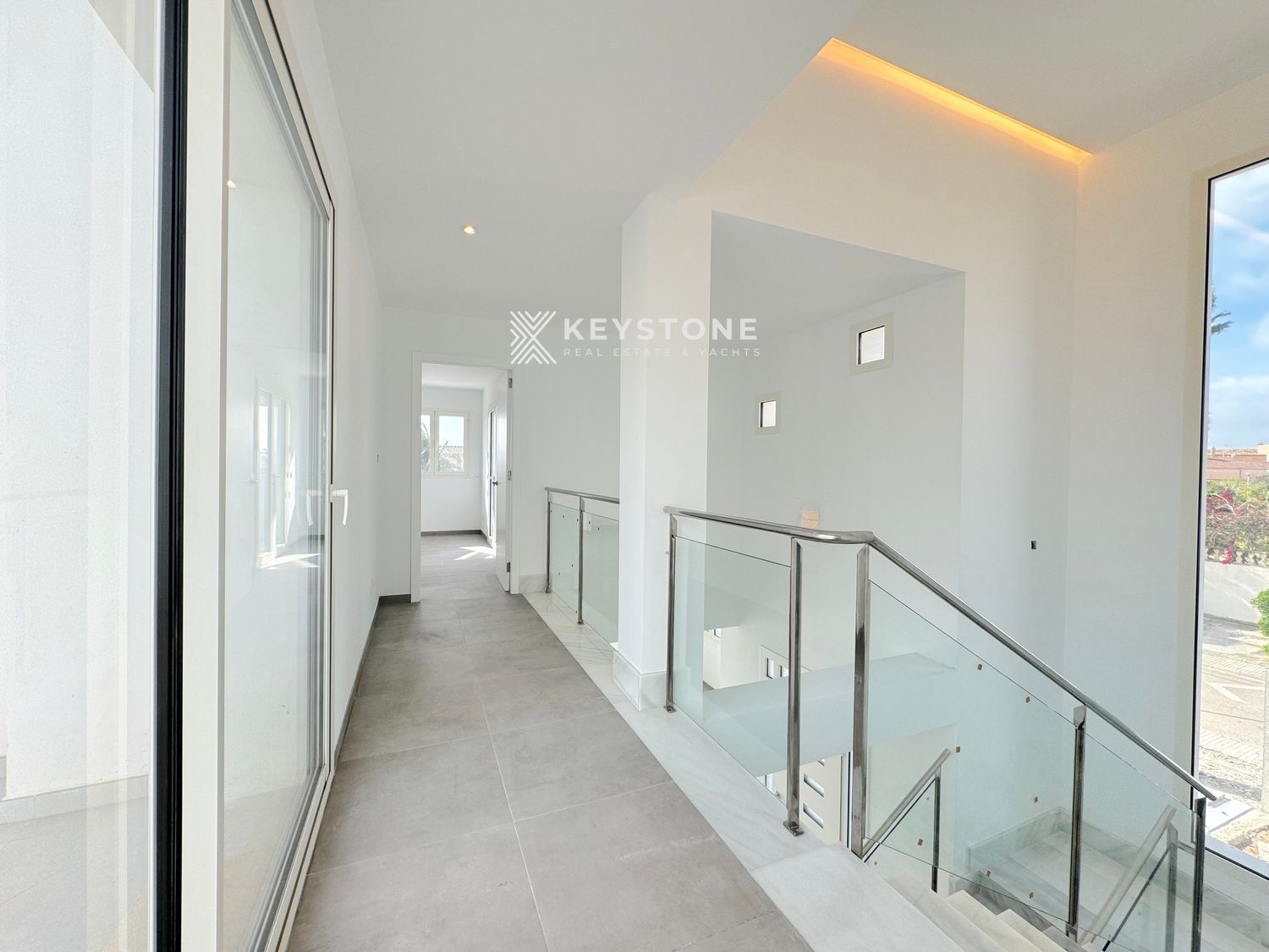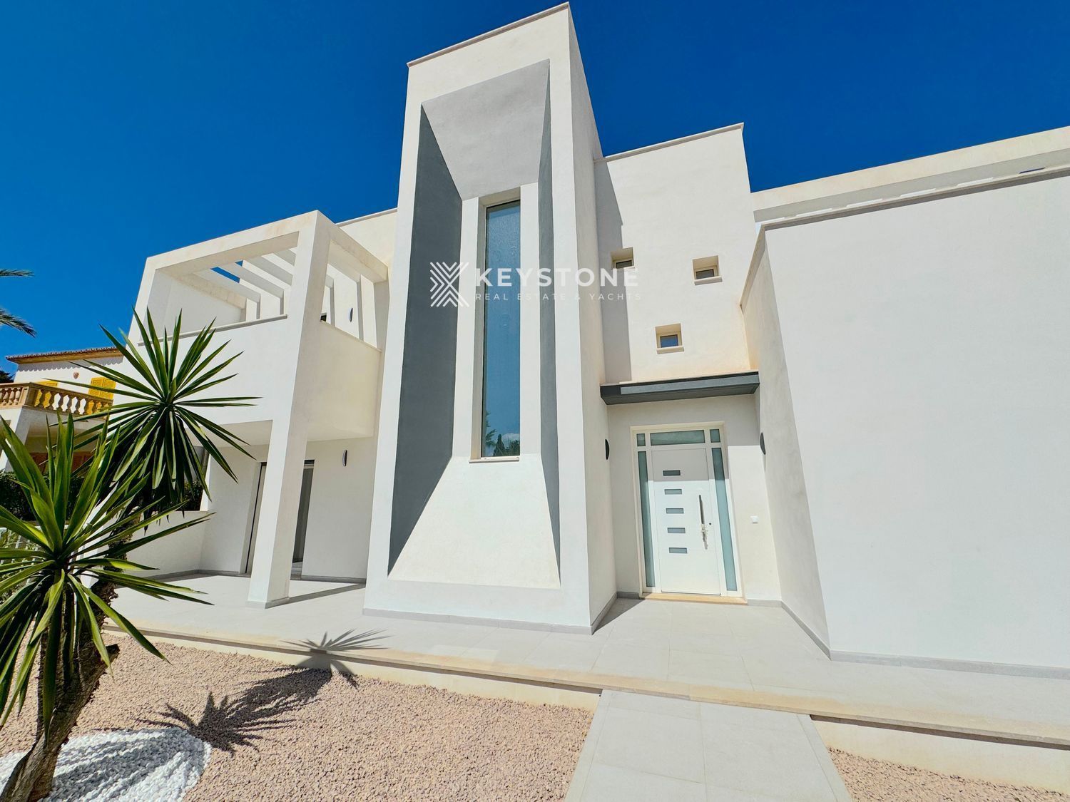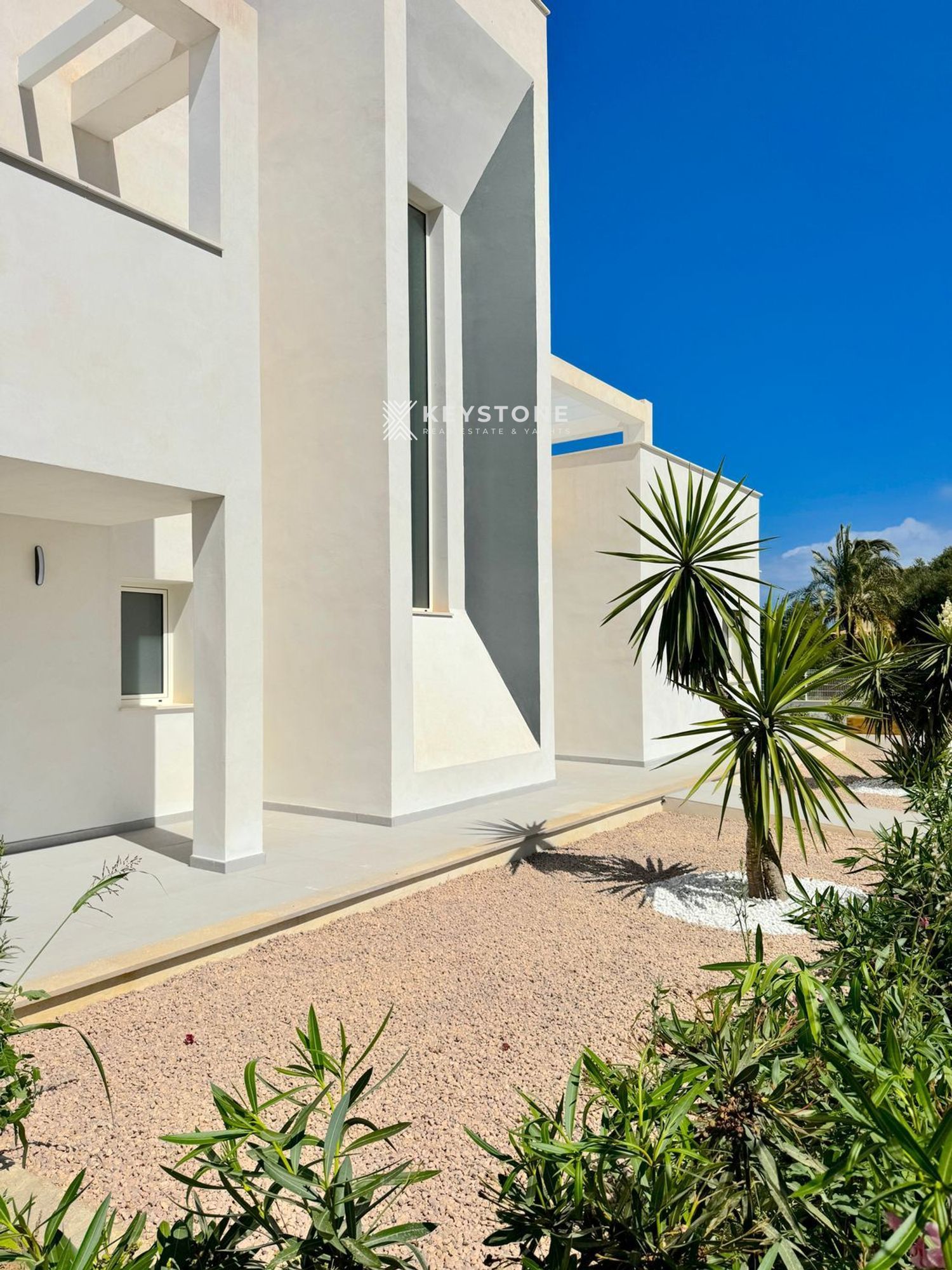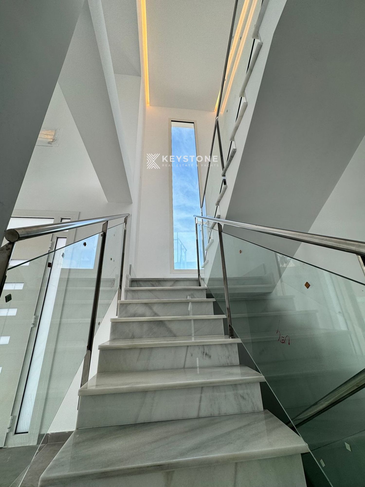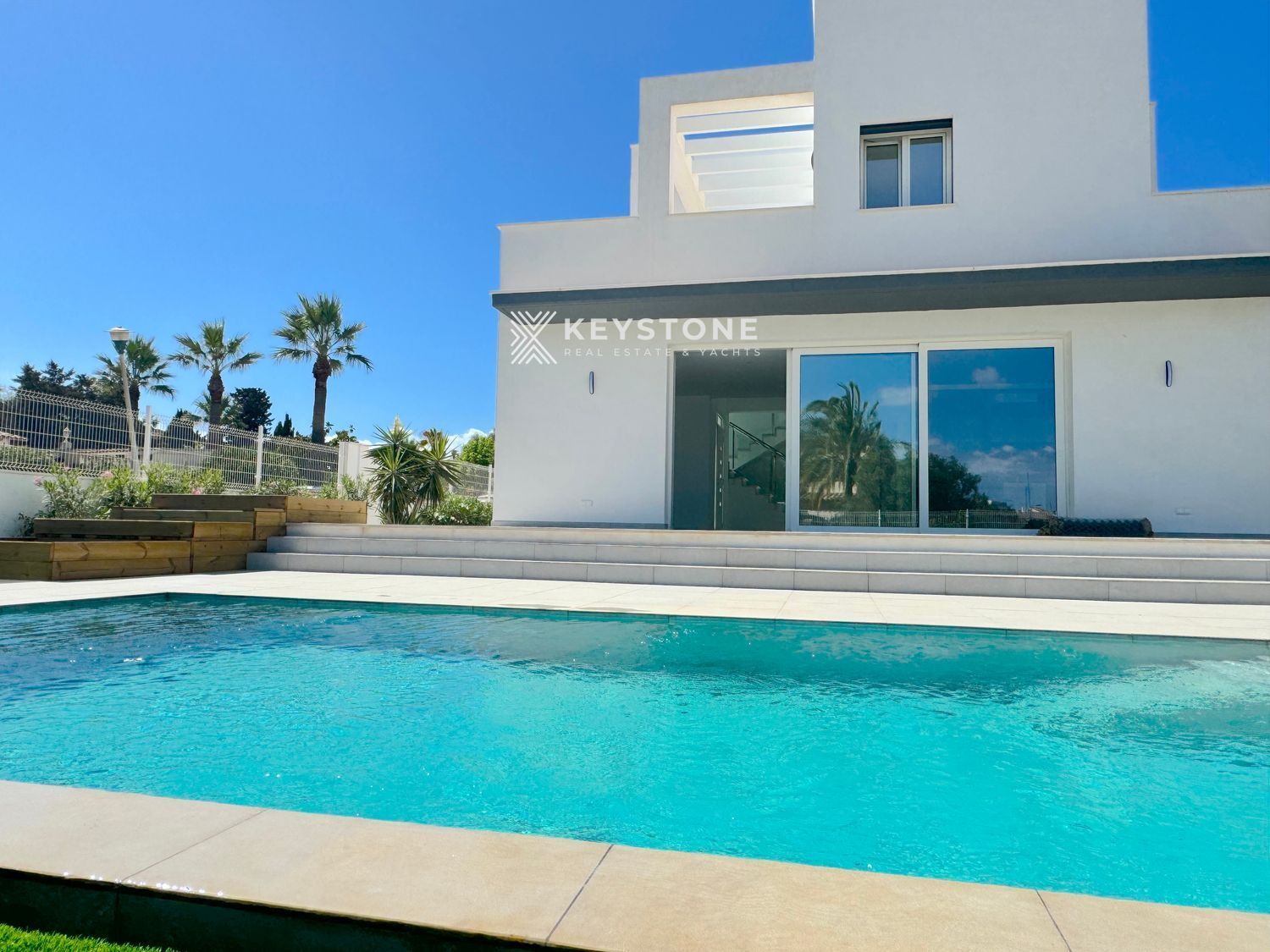 The modern open kitchen with cooking island, the spacious dining area and the bright living room with floor-to-ceiling windows create a stylish and inviting atmosphere. Spread over two floors, the villa offers 4 spacious bedrooms and 4 elegant bathrooms with walk-in showers and high-quality finishes.