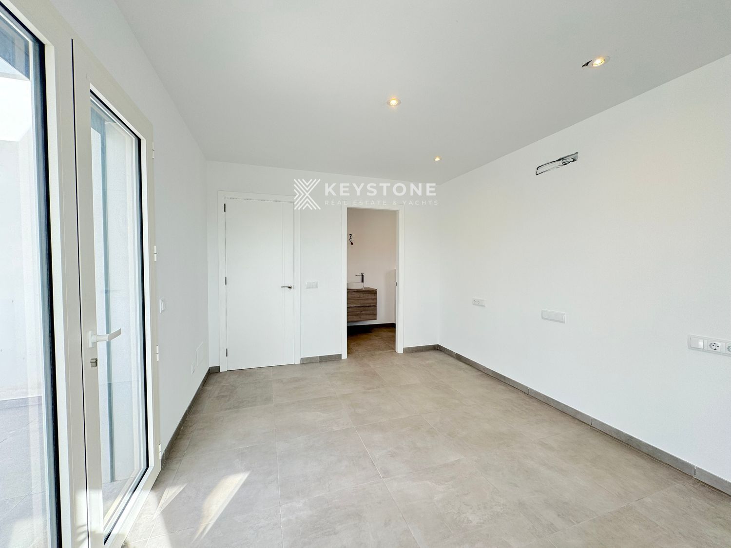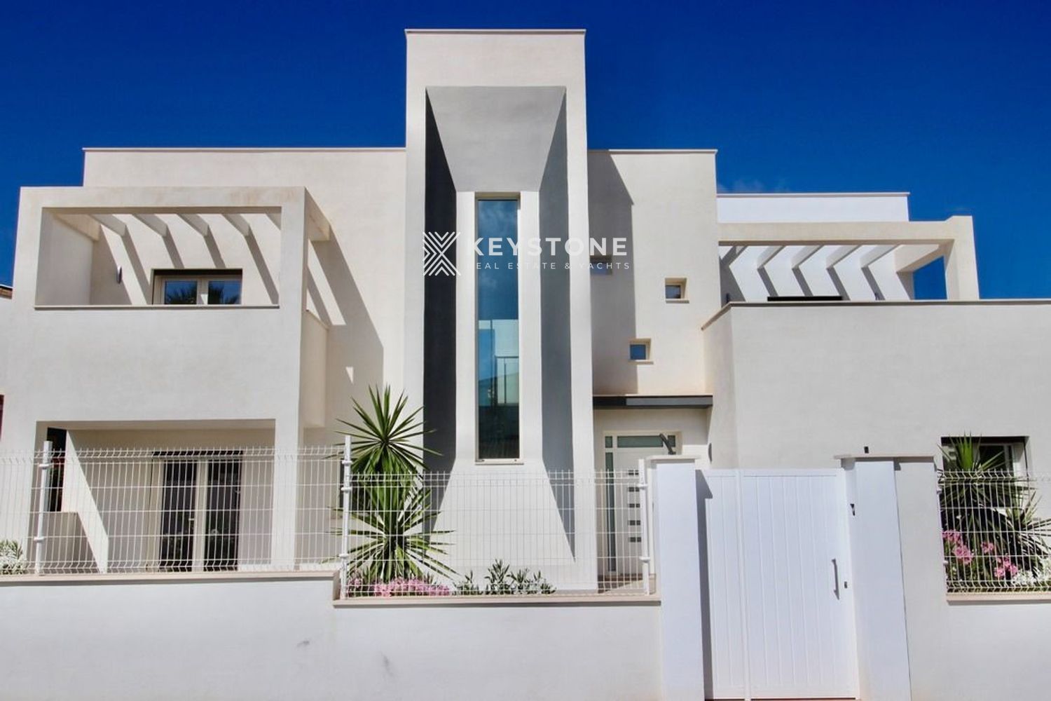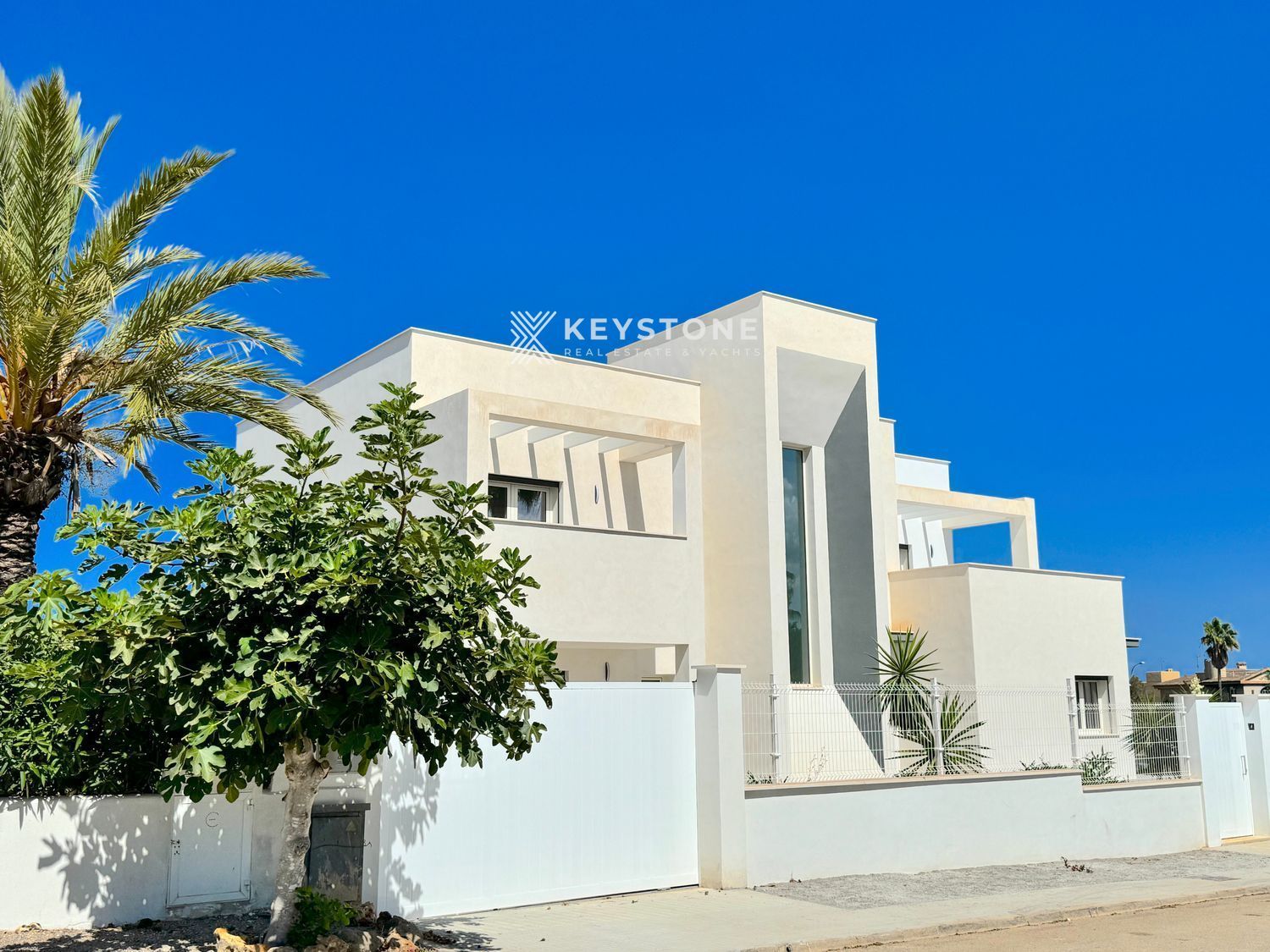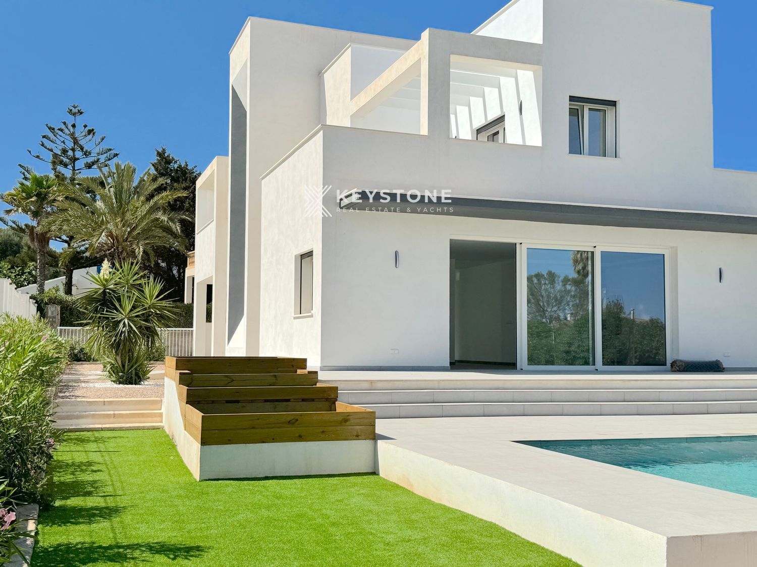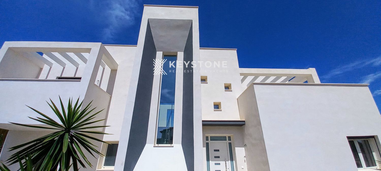 The modern open kitchen with cooking island, the spacious dining area and the bright living room with floor-to-ceiling windows create a stylish and inviting atmosphere. Spread over two floors, the villa offers 4 spacious bedrooms and 4 elegant bathrooms with walk-in showers and high-quality finishes.