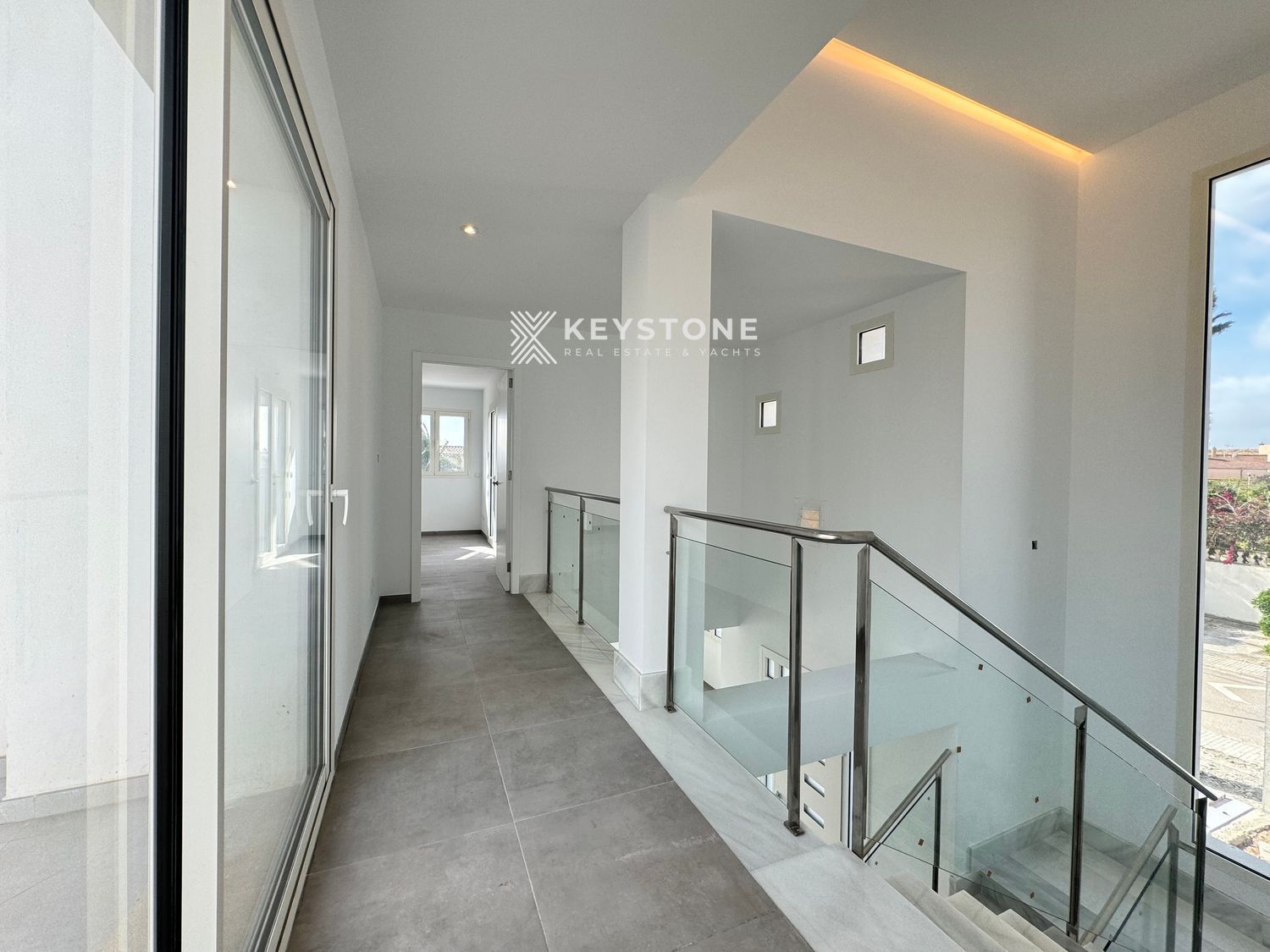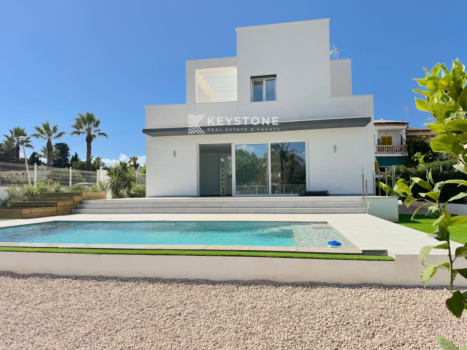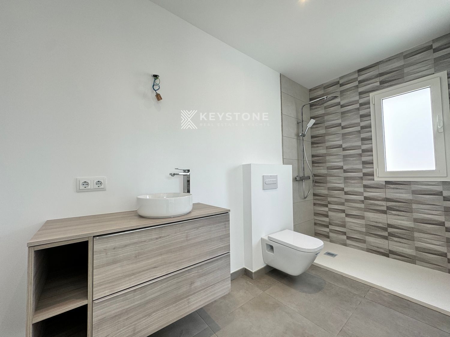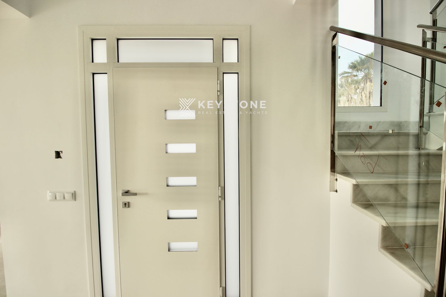 The modern open kitchen with cooking island, the spacious dining area and the bright living room with floor-to-ceiling windows create a stylish and inviting atmosphere. Spread over two floors, the villa offers 4 spacious bedrooms and 4 elegant bathrooms with walk-in showers and high-quality finishes.