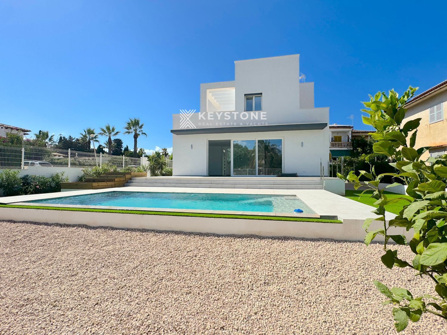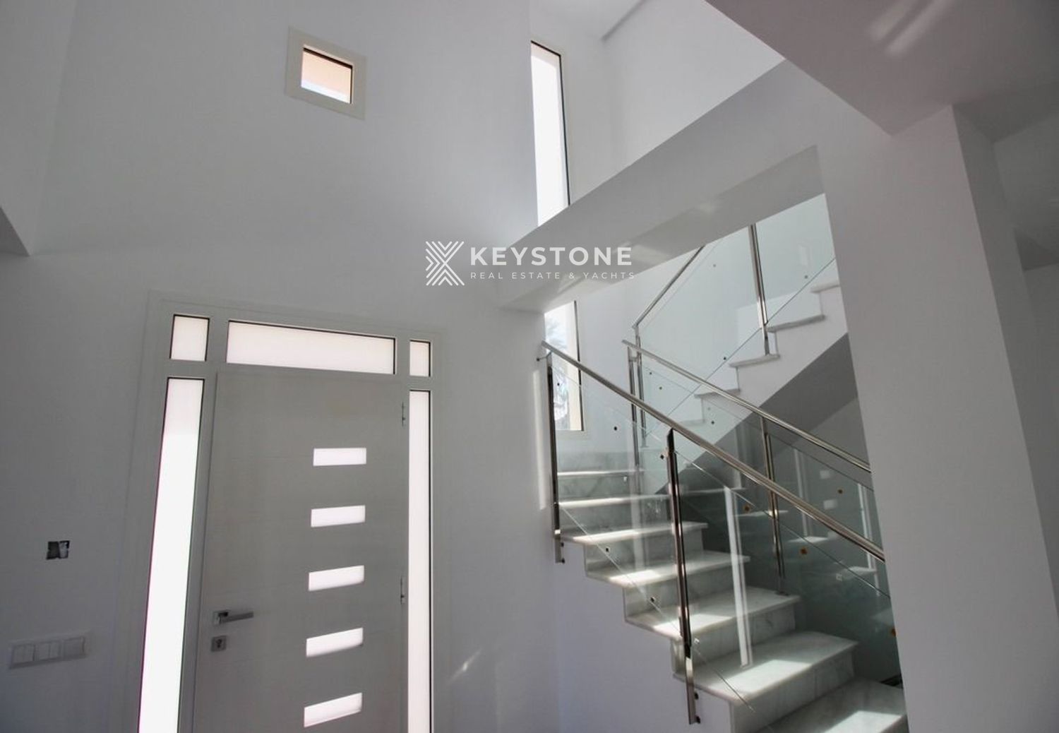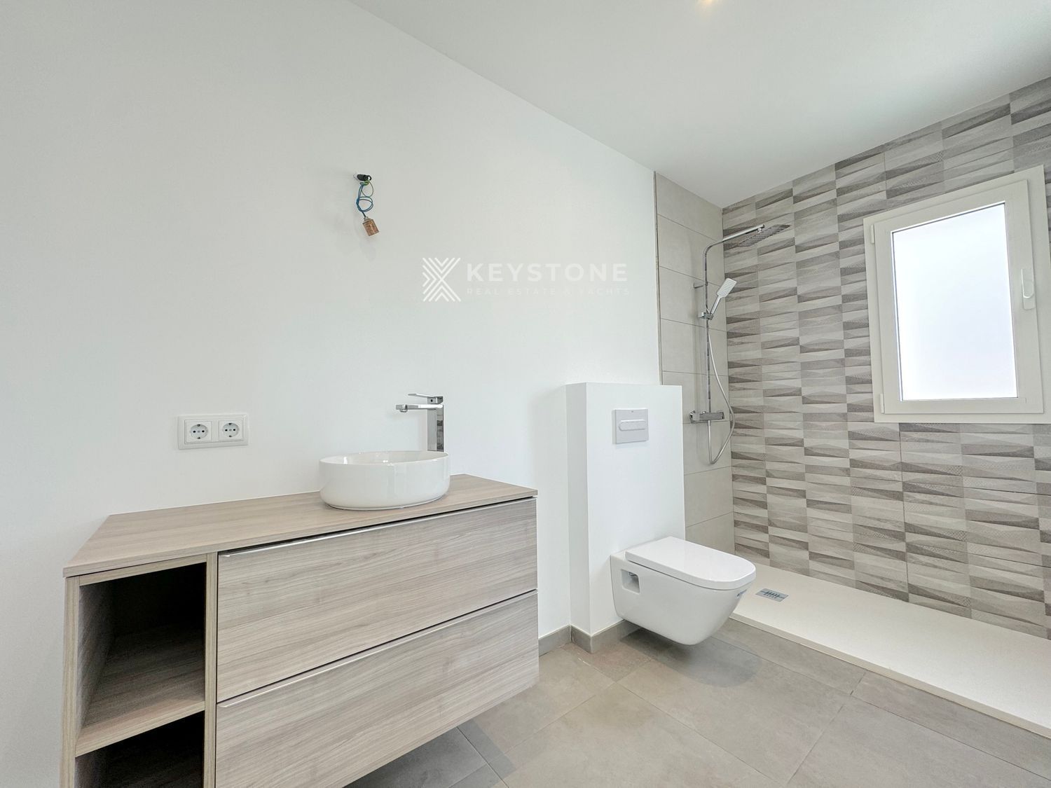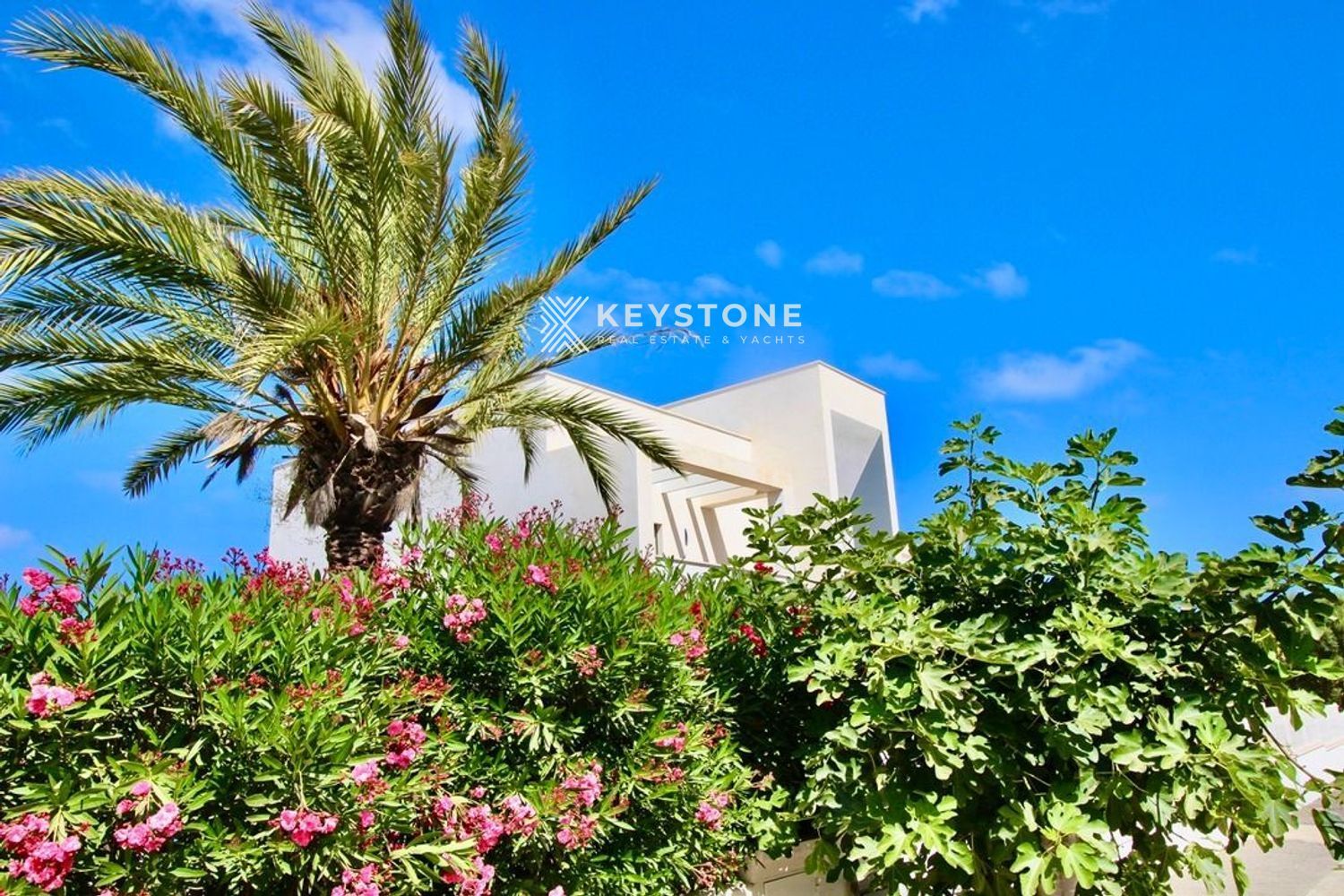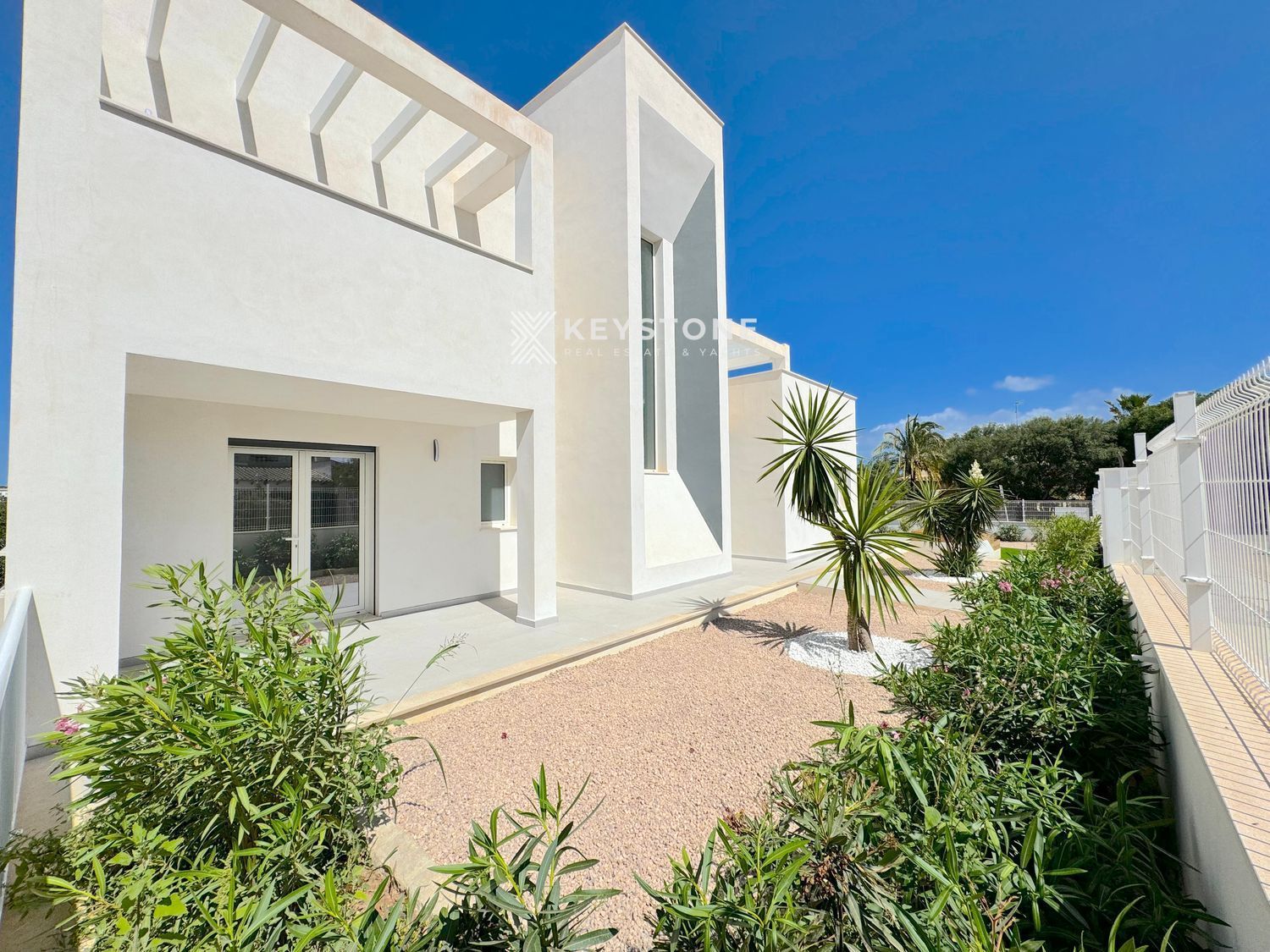 The modern open kitchen with cooking island, the spacious dining area and the bright living room with floor-to-ceiling windows create a stylish and inviting atmosphere. Spread over two floors, the villa offers 4 spacious bedrooms and 4 elegant bathrooms with walk-in showers and high-quality finishes.