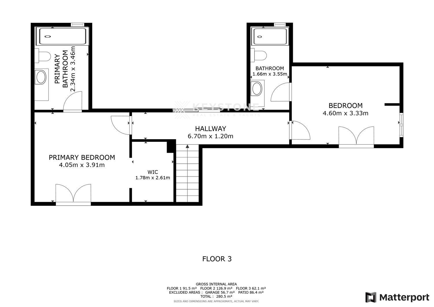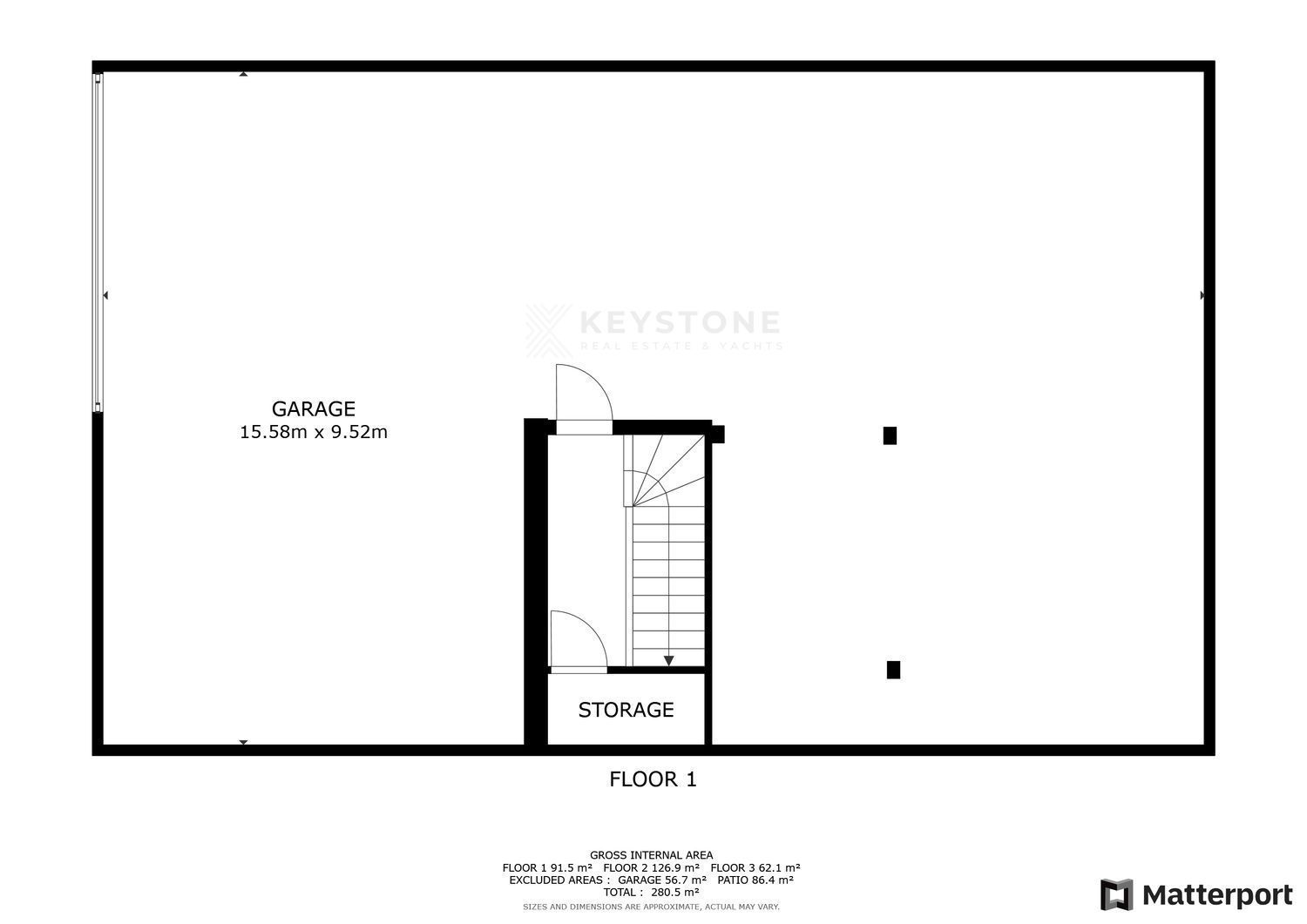 The large garage accommodates several vehicles and is easily accessible through an automatic sliding door.