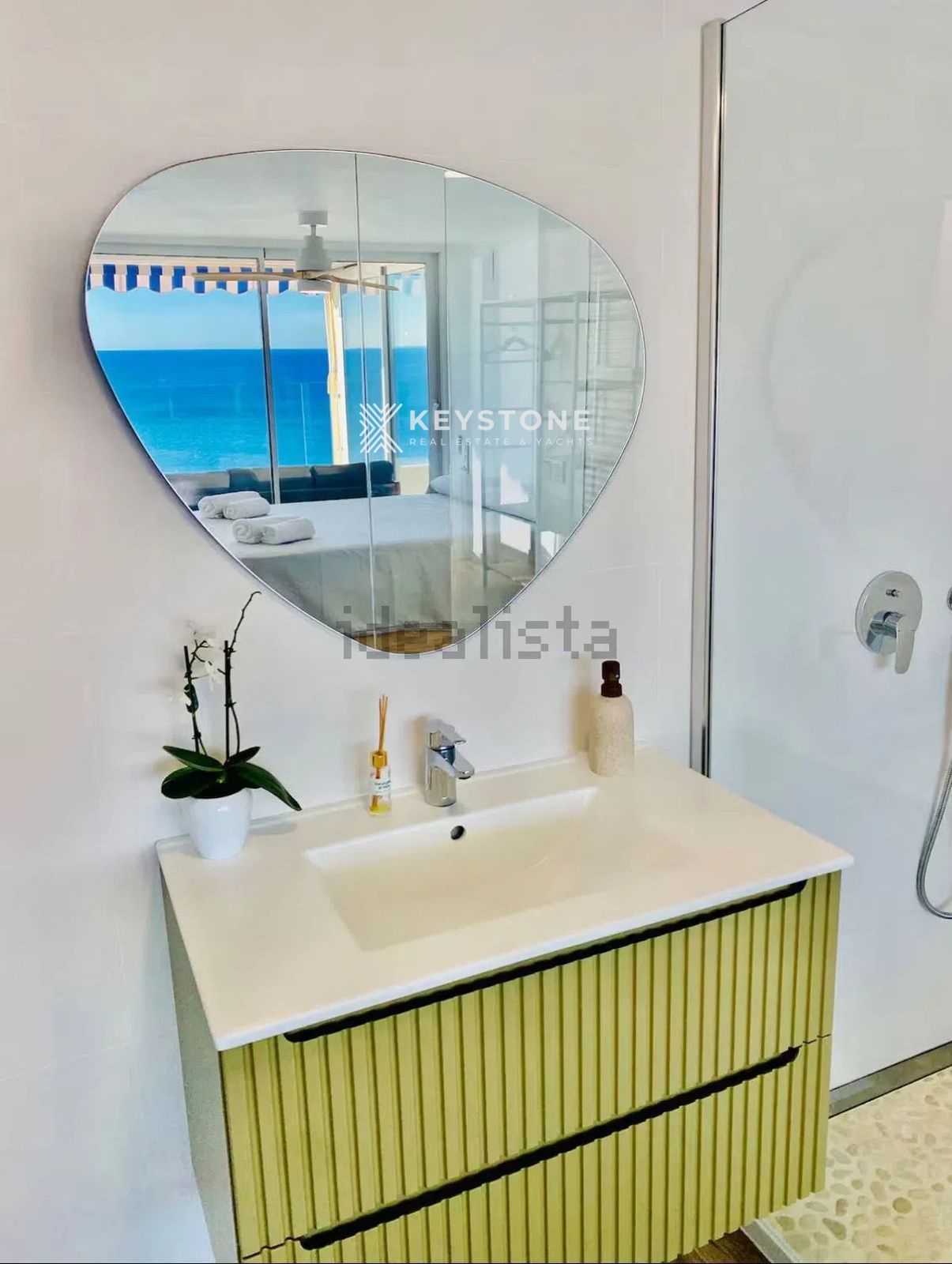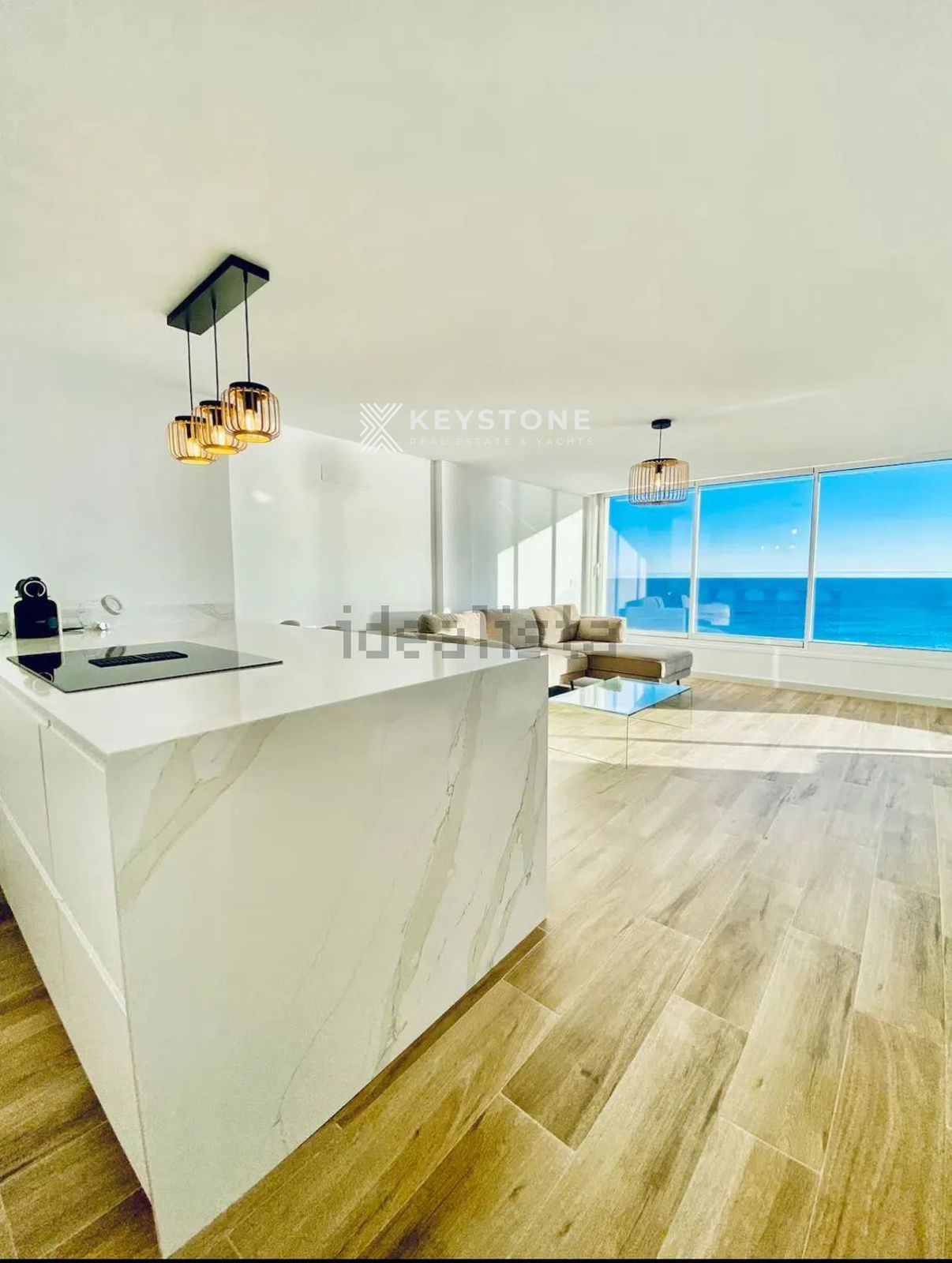 The property features three double bedrooms, one of them with spectacular sea views, and two modern, fully equipped bathrooms. The spacious living-dining area includes a Smart TV and direct access to the terrace. The open-plan kitchen is fully equipped with appliances, complete kitchenware and a Nespresso coffee machine.