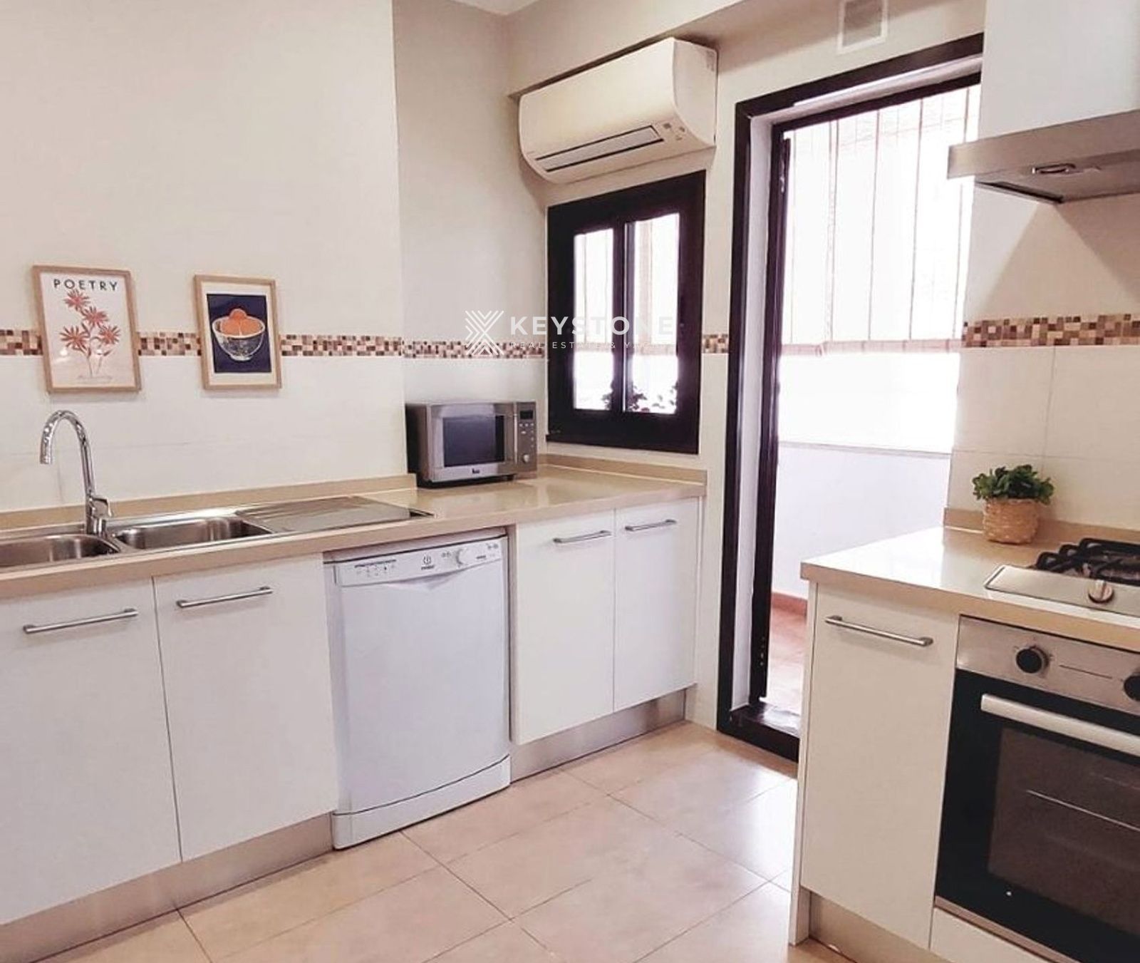 La cocina es funcional y está totalmente equipada. Desde ella se accede a una terraza posterior con coladuría, que aporta un espacio adicional muy práctico. El piso ha sido reformado con altas calidades, cuenta con suelos de tarima laminada, aire acondicionado frío/calor en todas las estancias y ventanas con buen aislamiento térmico y acústico.