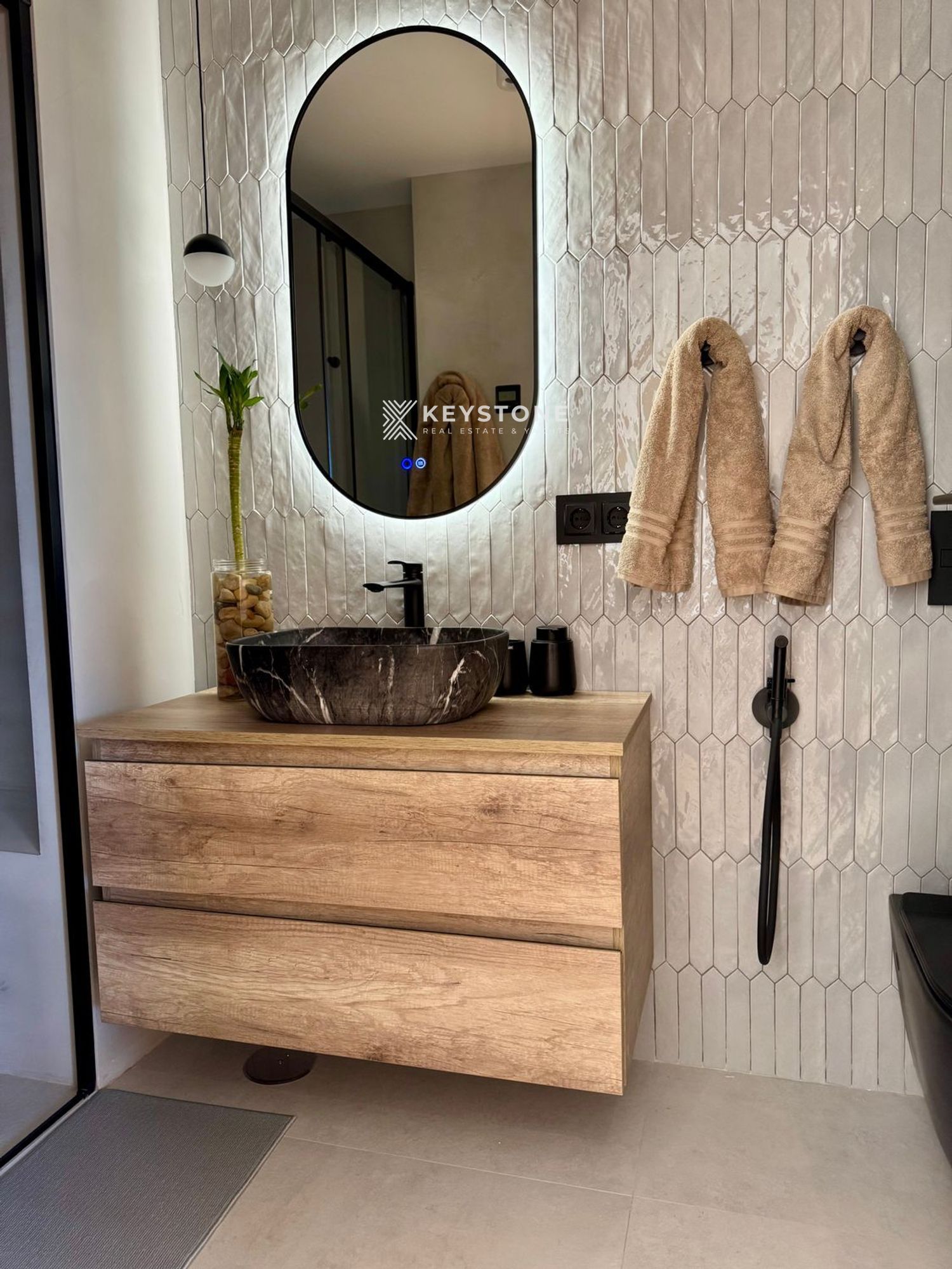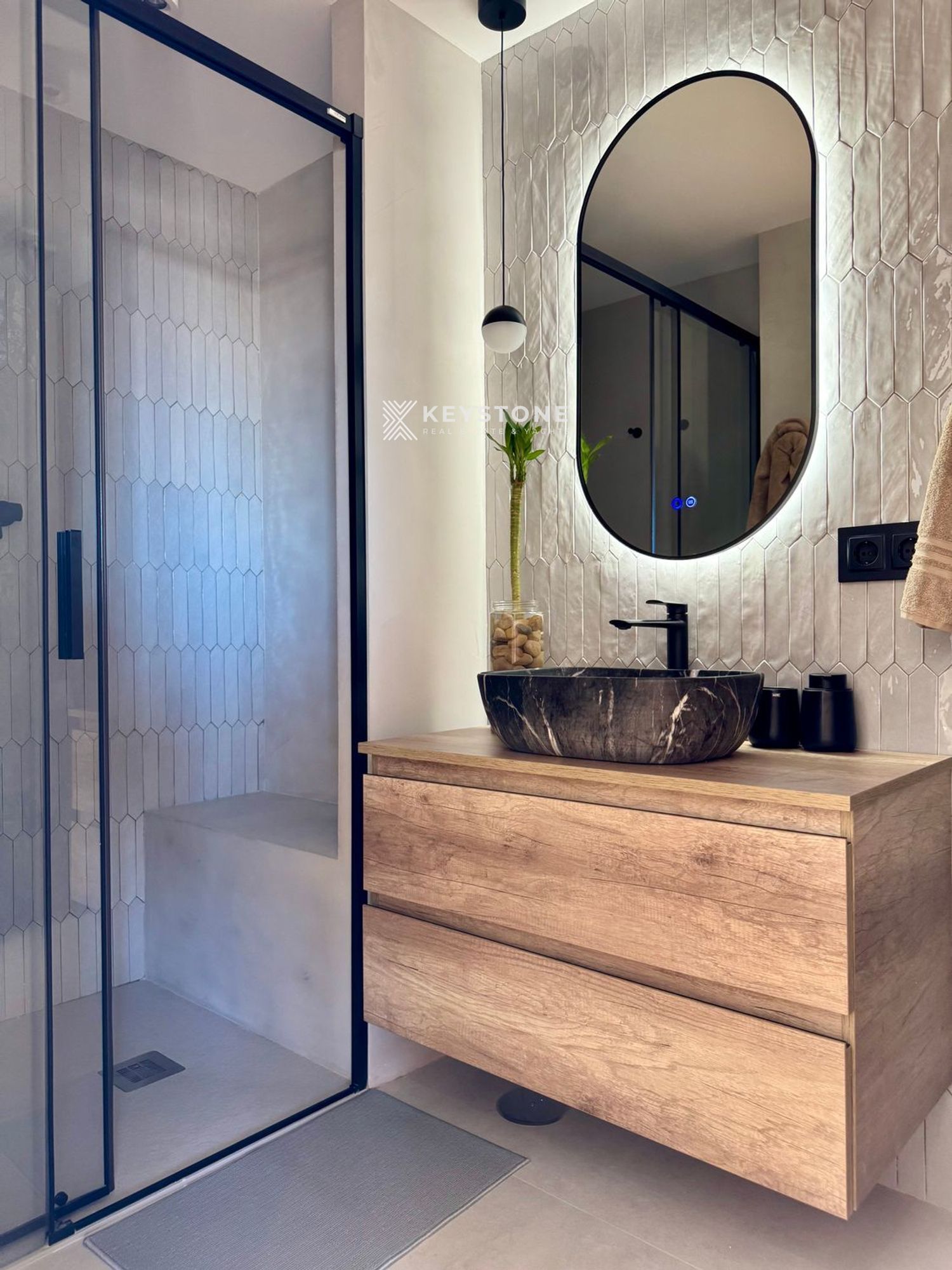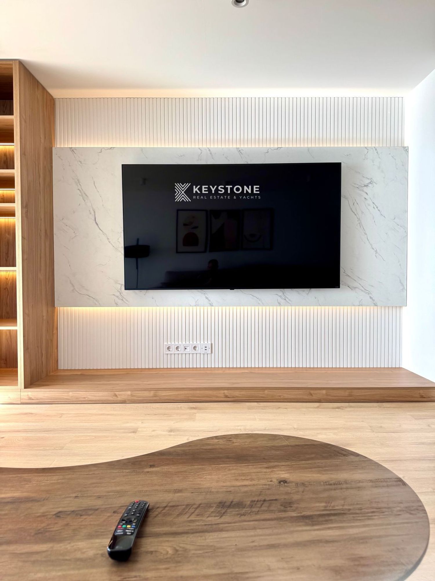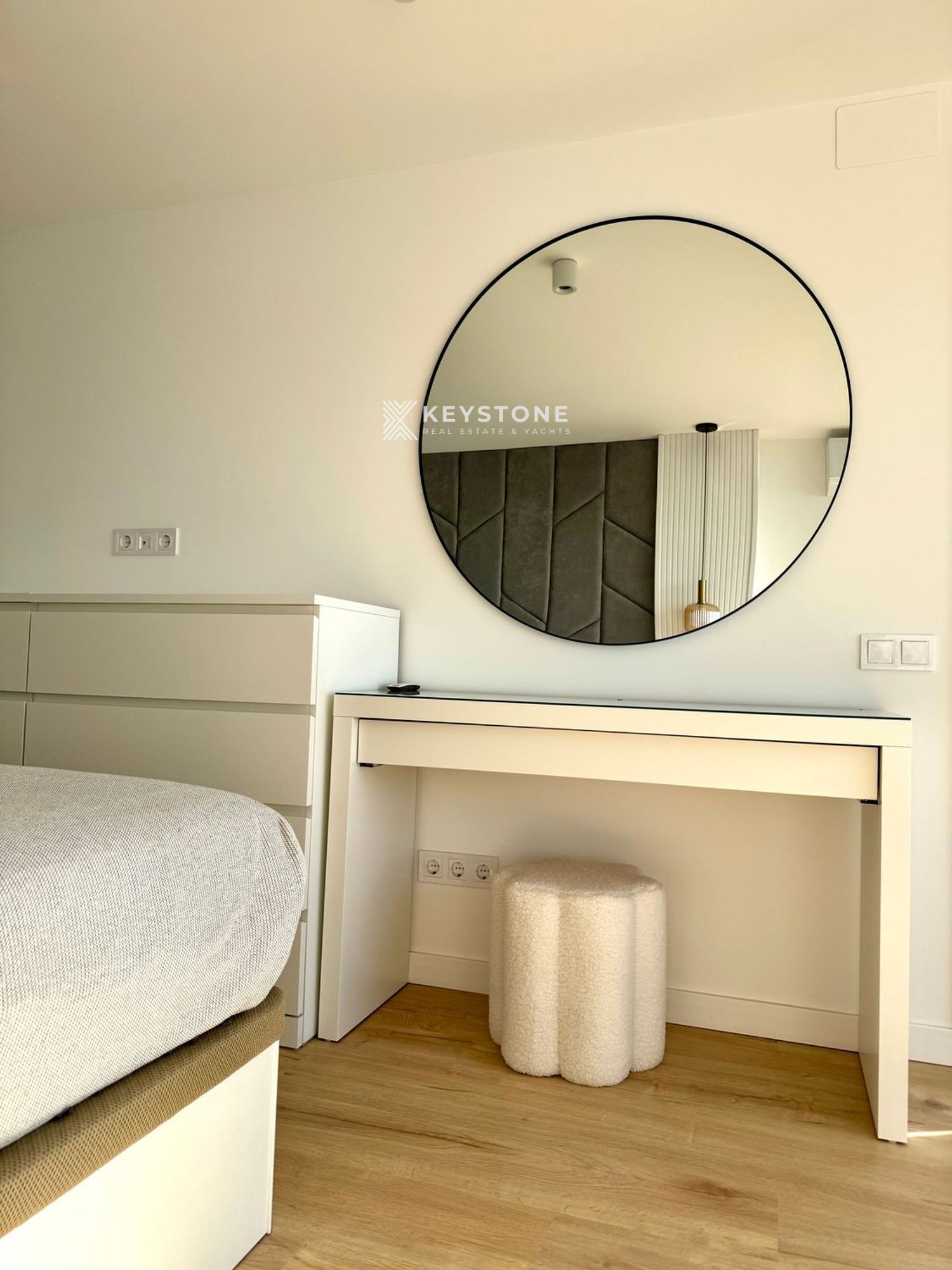 La vivienda dispone de 85 m² construidos, distribuidos en dos amplios dormitorios y dos baños completos con suelo radiante. Se entrega totalmente amueblada, con camas grandes y colchones ortopédicos premium, cocina equipada con electrodomésticos Bosch, lavadora, secadora y lavavajillas, además de un salón con televisor LG de 75 pulgadas y conexión WiFi de alta velocidad (10 GB).