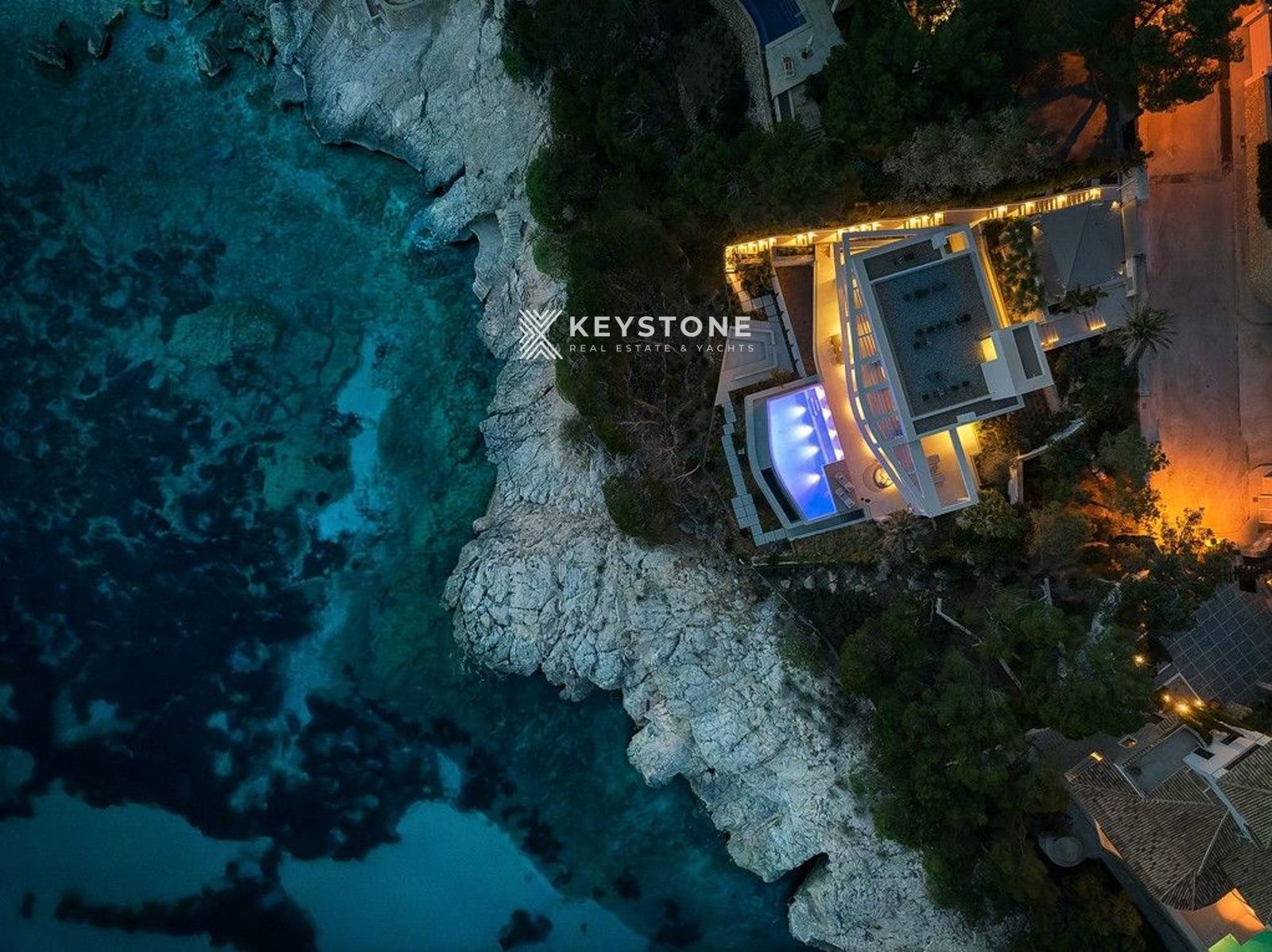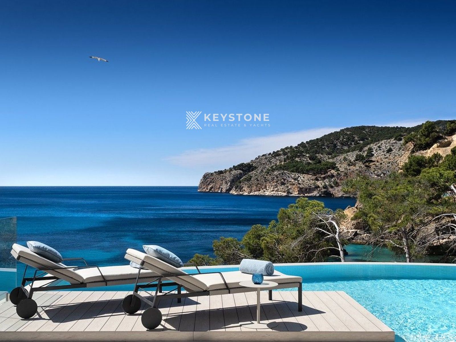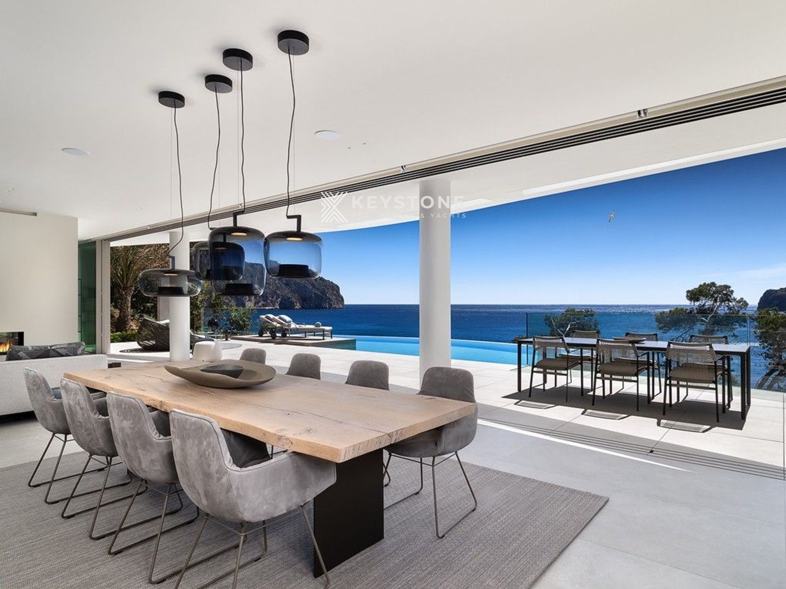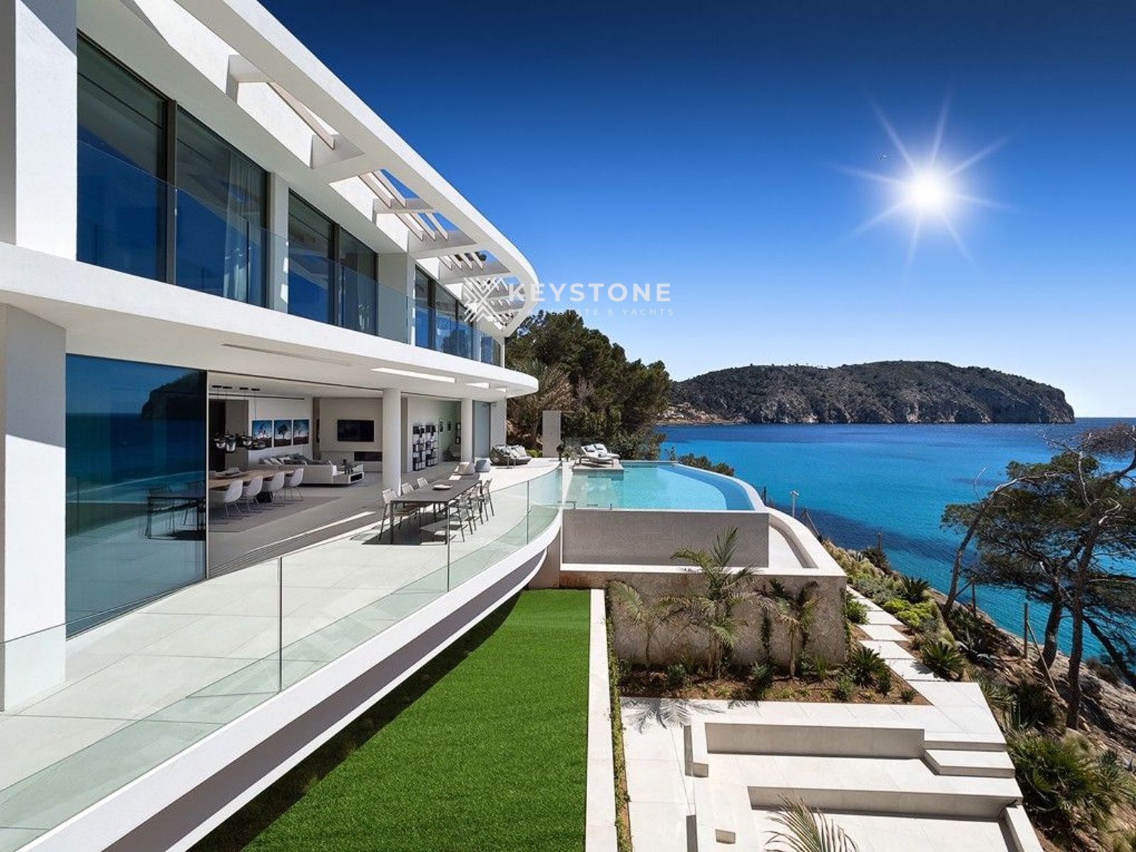 La villa cuenta con un amplio salón-comedor de planta abierta con cocina y cocina auxiliar, cinco suites con baño en suite, gimnasio y zona de spa completamente equipada, lavadero y una sala multifuncional personalizable. La piscina infinity y las terrazas ofrecen espectaculares panorámicas al mar.