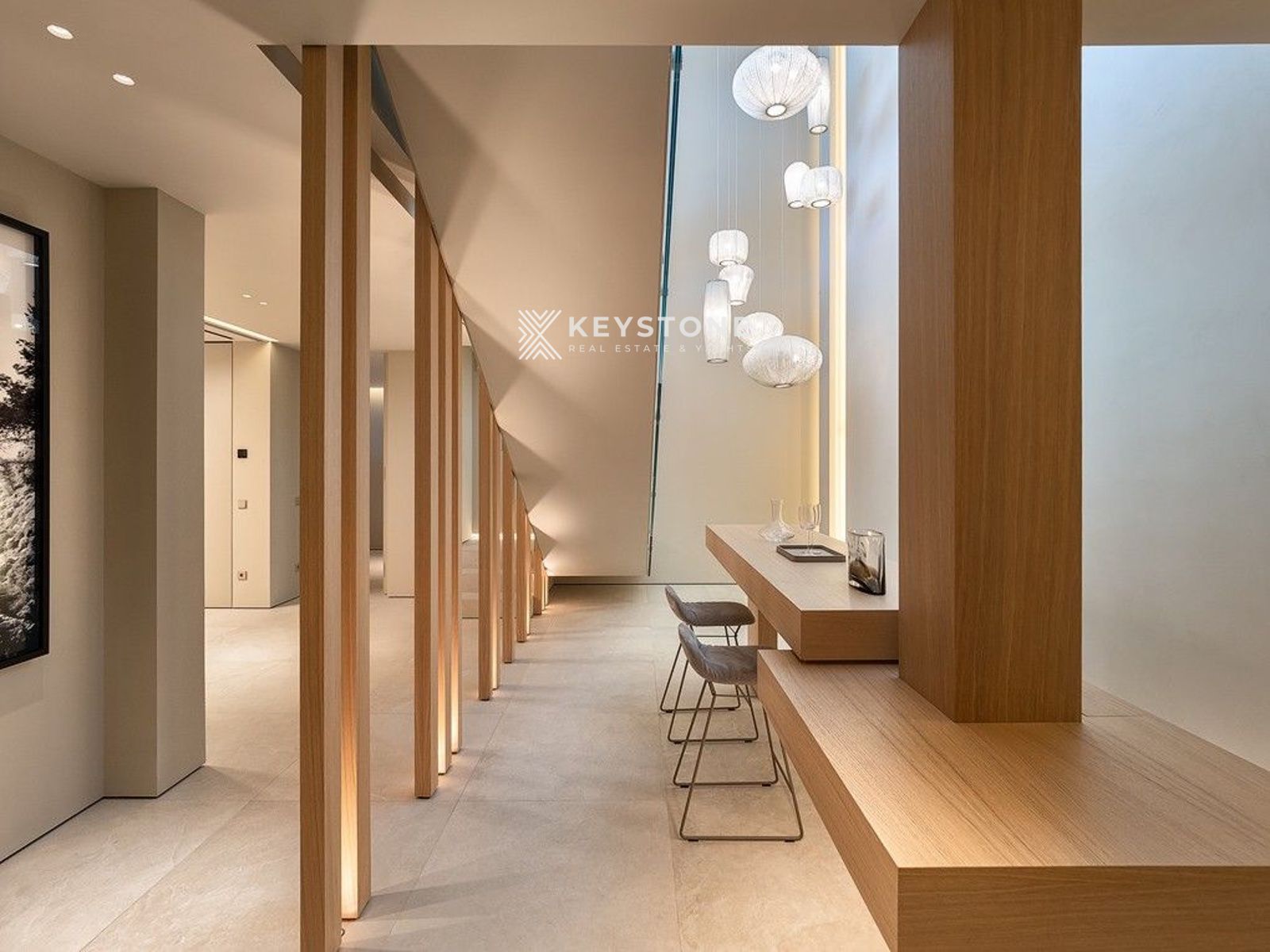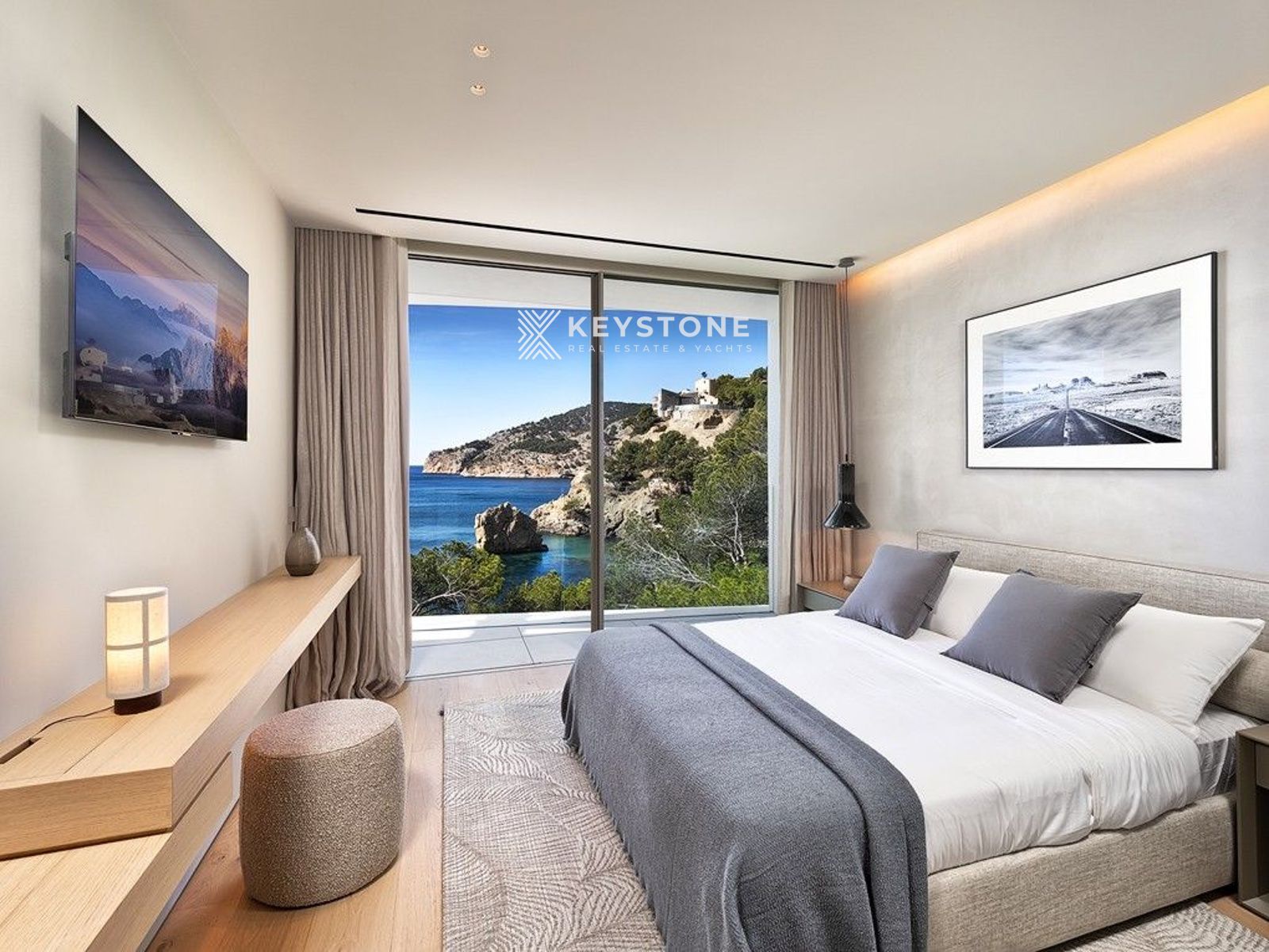El diseño interior de esta villa redefine el concepto de lujo contemporáneo. Los armarios y la cocina, diseñados por Poliform, junto con los elegantes detalles de cristal de Rimadesio, crean un ambiente de sofisticada modernidad. Los baños, equipados con accesorios de Antonio Lupi, son verdaderas obras de arte funcionales. La decoración interior, seleccionada con precisión por TERRAZA BALEAR, incluye mobiliario de marcas como Minotti, Flexform, Freifrau y Janua, ofreciendo una elegancia atemporal. En el exterior, los muebles de Tribú y B&B Italia invitan al descanso y la contemplación del entorno natural.