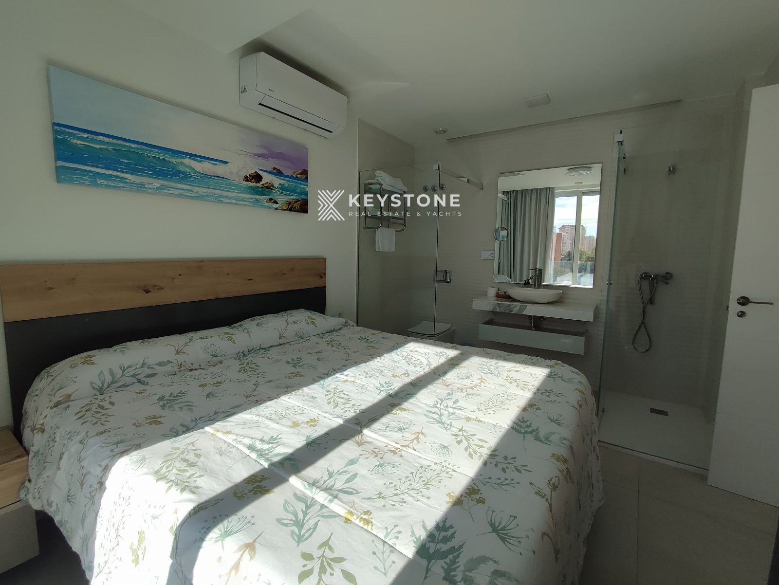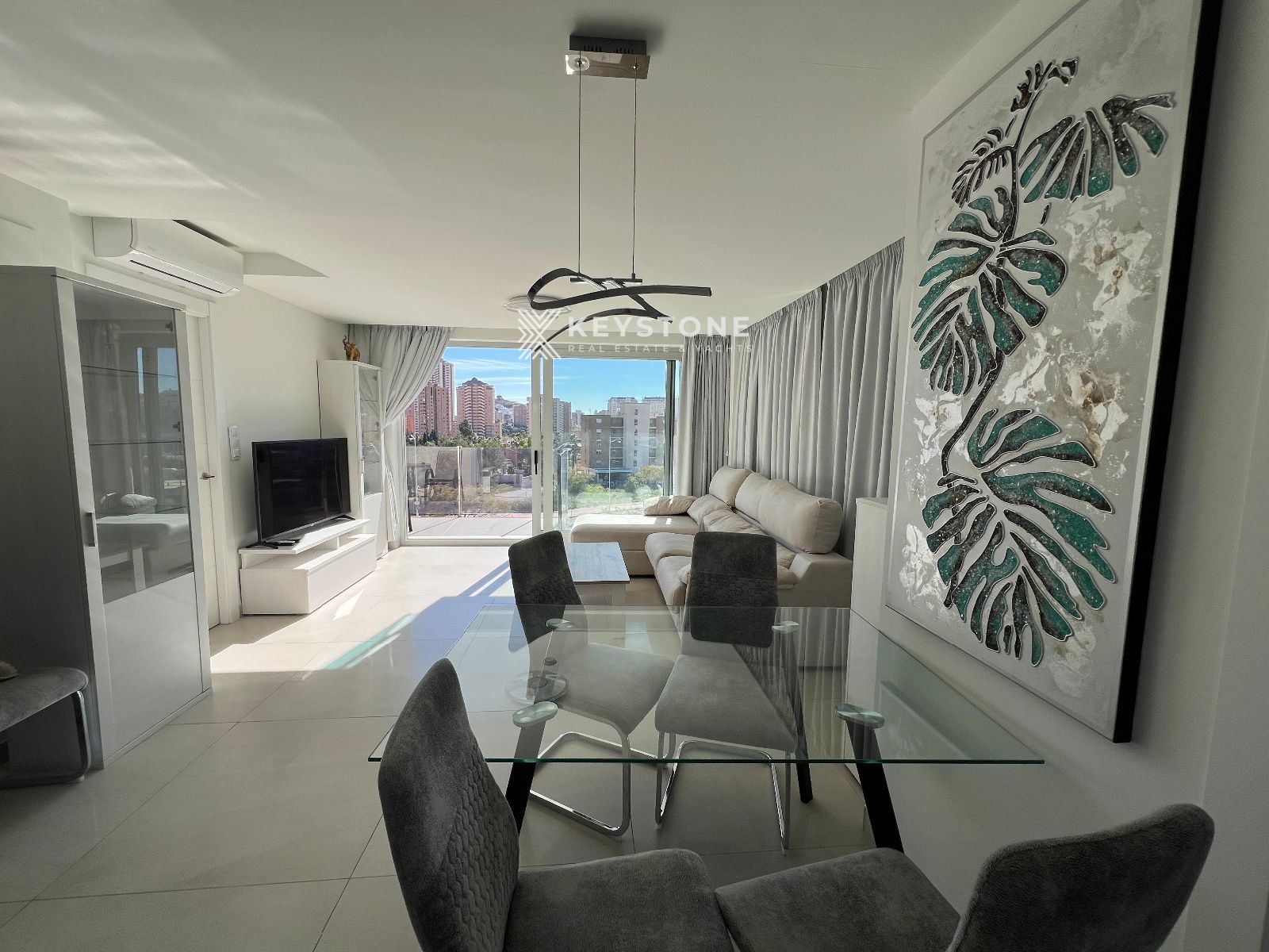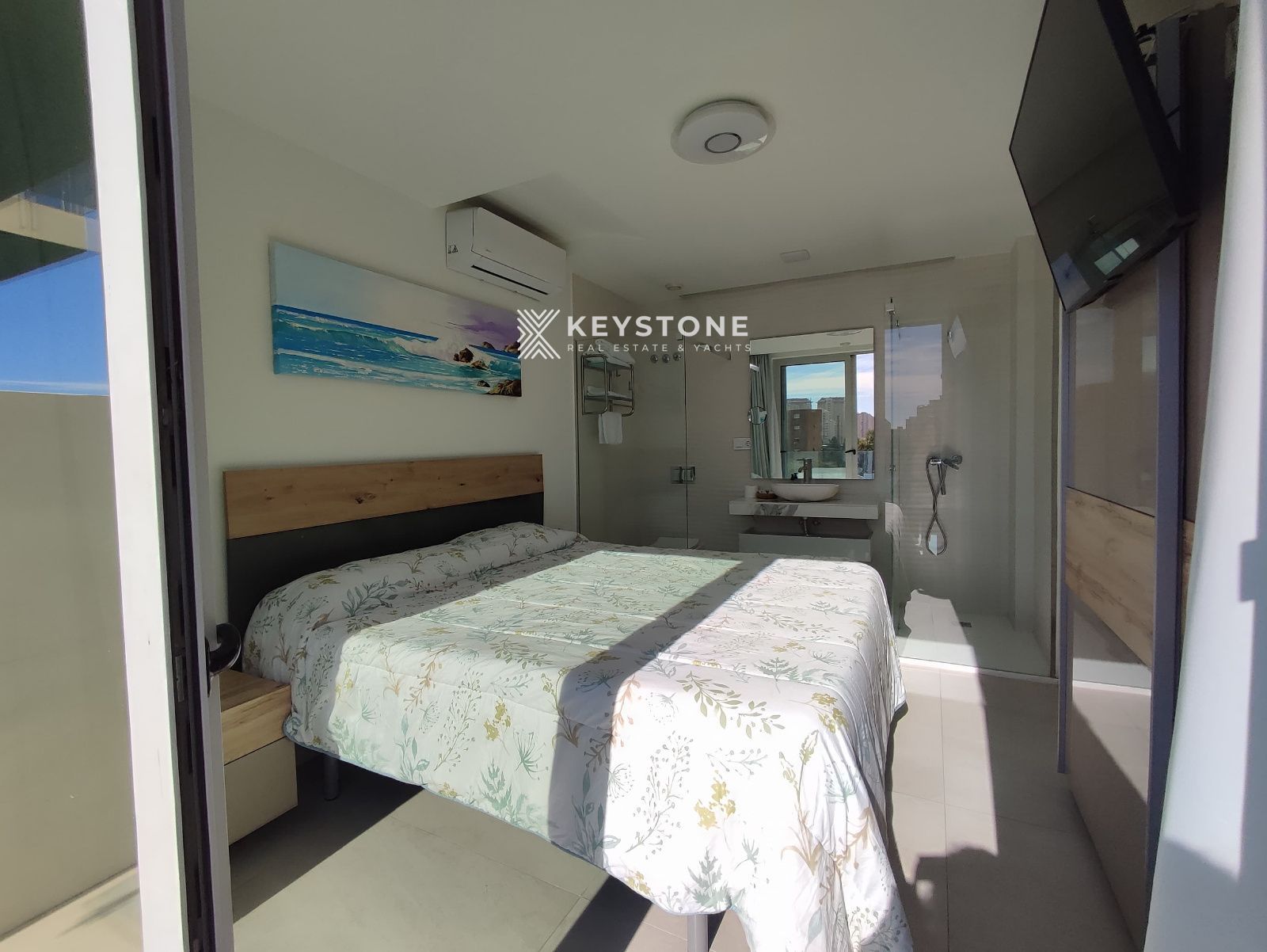 Dispone de dos dormitorios y dos baños completos, uno de ellos en suite. El dormitorio principal cuenta con grandes ventanales que aportan un ambiente moderno y elegante. Destaca su terraza privada de 15 m², con orientación sur y oeste, ideal para disfrutar del clima mediterráneo durante todo el año y de agradables vistas abiertas hacia los lugares más emblemáticos de Benidorm.
