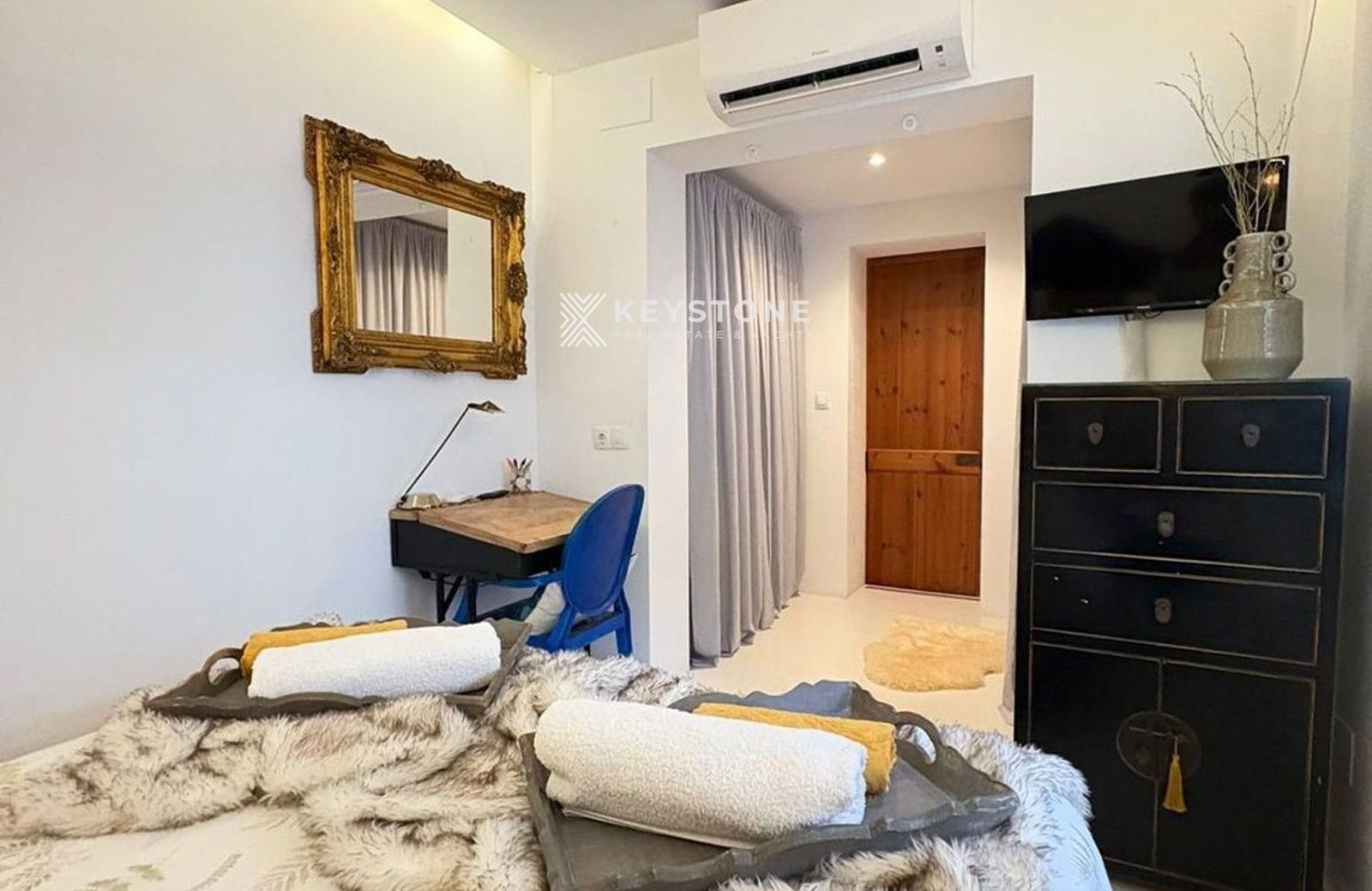 El dormitorio dispone de vestidor, proporcionando un espacio cómodo y bien organizado. Los sistemas de aire acondicionado son nuevos, tanto en el salón como en el dormitorio.