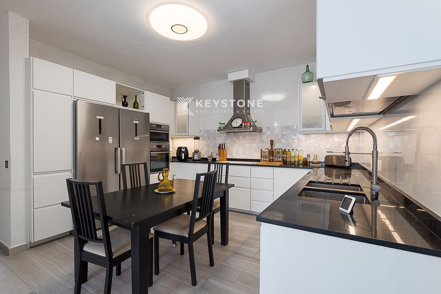 Cocina de diseño moderno: Encimera de granito negro, suelo porcelánico, fregadero bajo encimera, termo para agua caliente instantánea y electrodomésticos de acero inoxidable (vitro inducción blanca de 80 cm, campana extractora de acero inox, lavavajillas integrado).