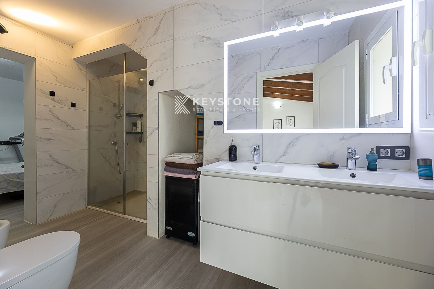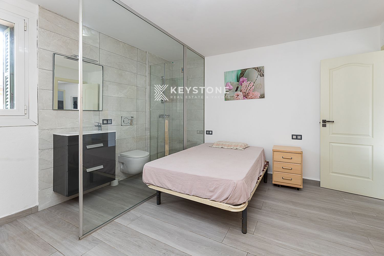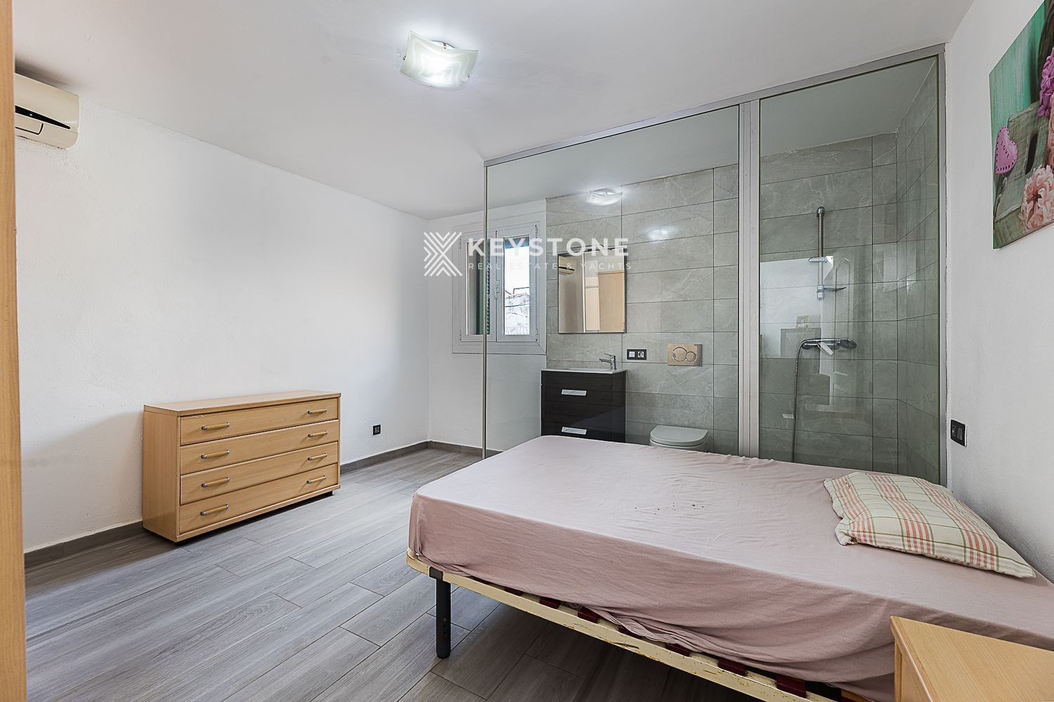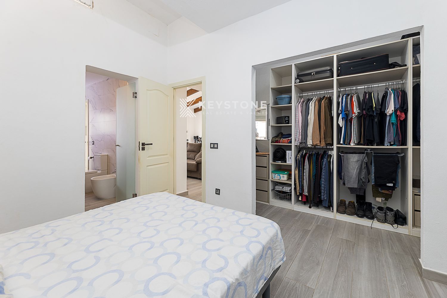 3 dormitorios y 3 baños: Dormitorio principal de 23 m² con vestidor independiente y baño en suite; segundo dormitorio de 16 m² con aire acondicionado y baño en suite; tercer dormitorio de 13 m², actualmente despacho, pero amueblado con cama y armario.