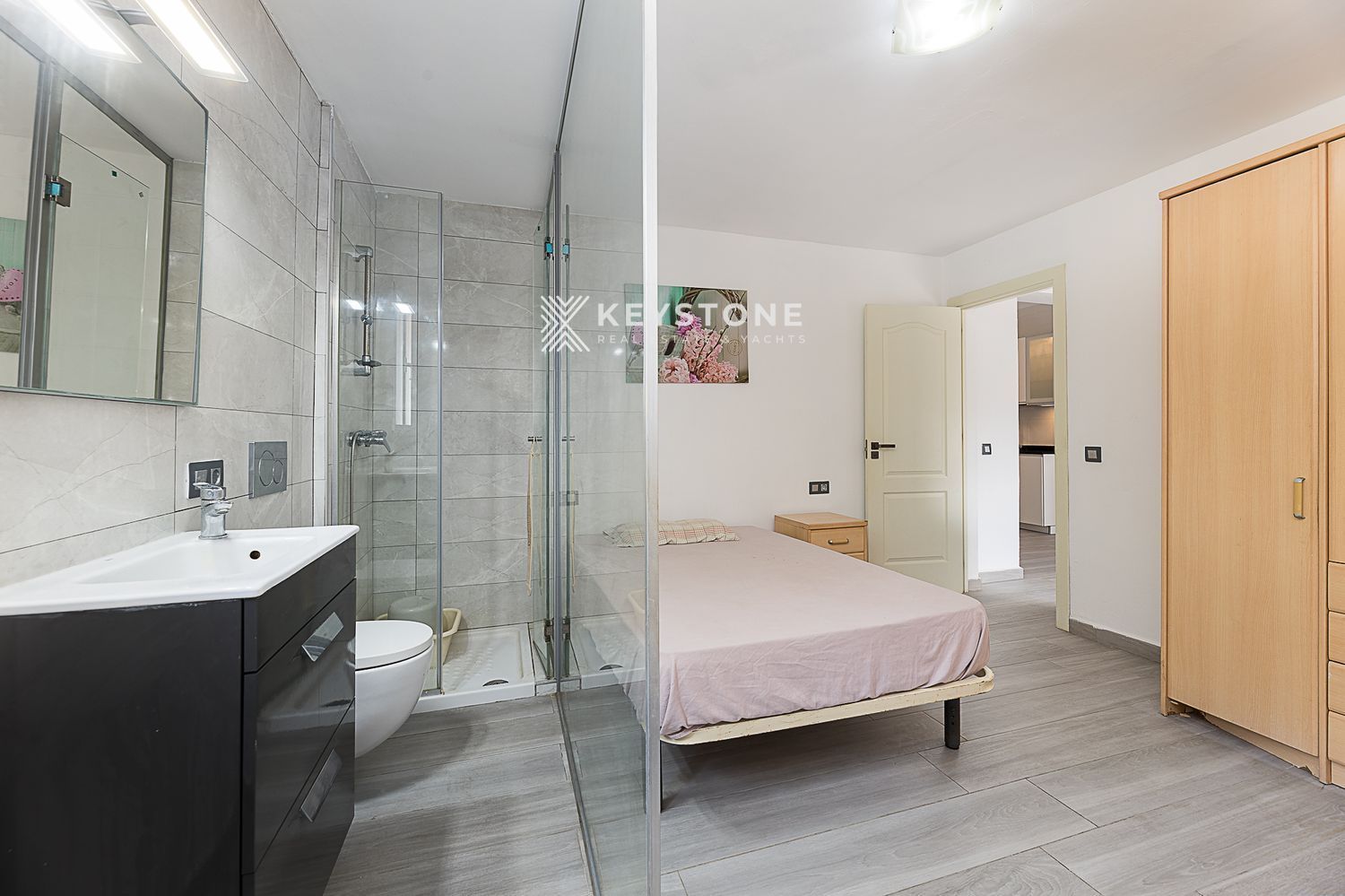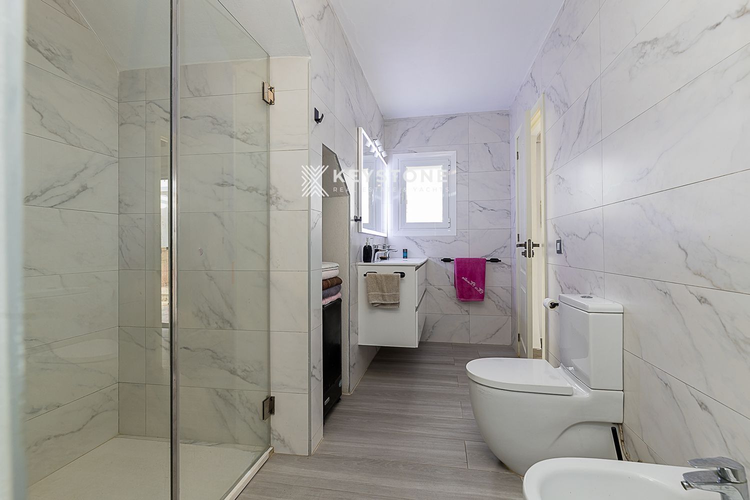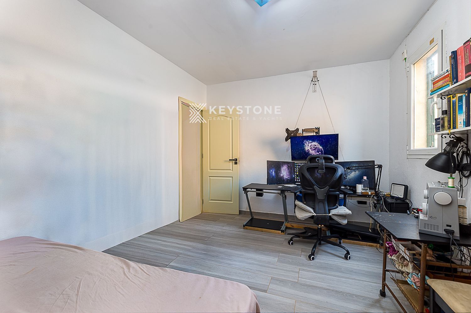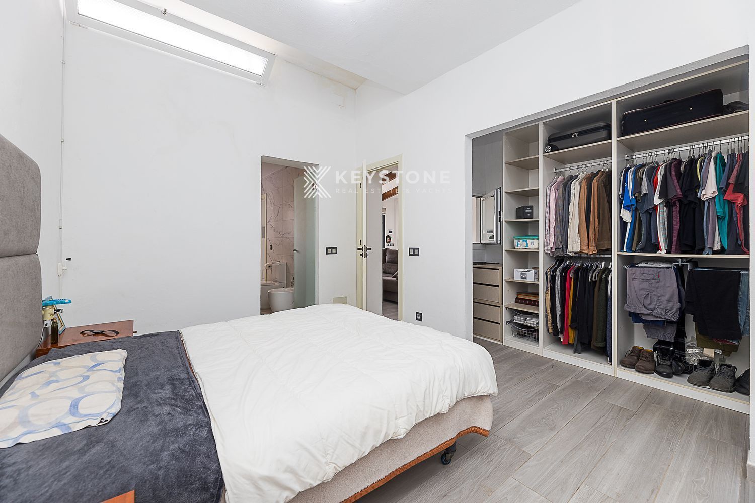 3 dormitorios y 3 baños: Dormitorio principal de 23 m² con vestidor independiente y baño en suite; segundo dormitorio de 16 m² con aire acondicionado y baño en suite; tercer dormitorio de 13 m², actualmente despacho, pero amueblado con cama y armario.